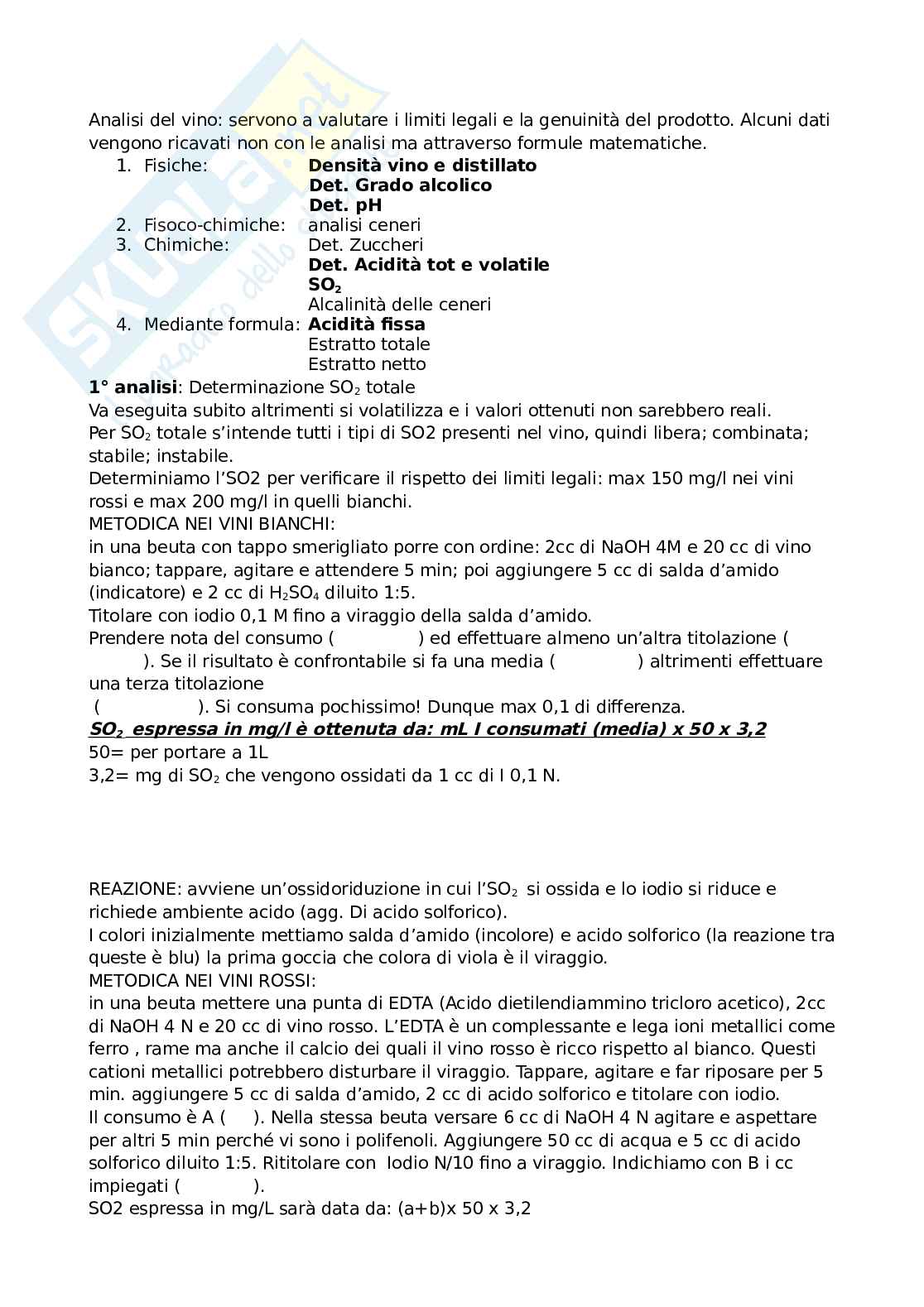 In una beuta con tappo smerigliato porre con ordine: 2cc di NaOH 4M e 20 cc di vino bianco; tappare, agitare e attendere 5 min; poi aggiungere 5 cc di salda d’amido (indicatore) e 2 cc di H2SO4 diluito 1:5.