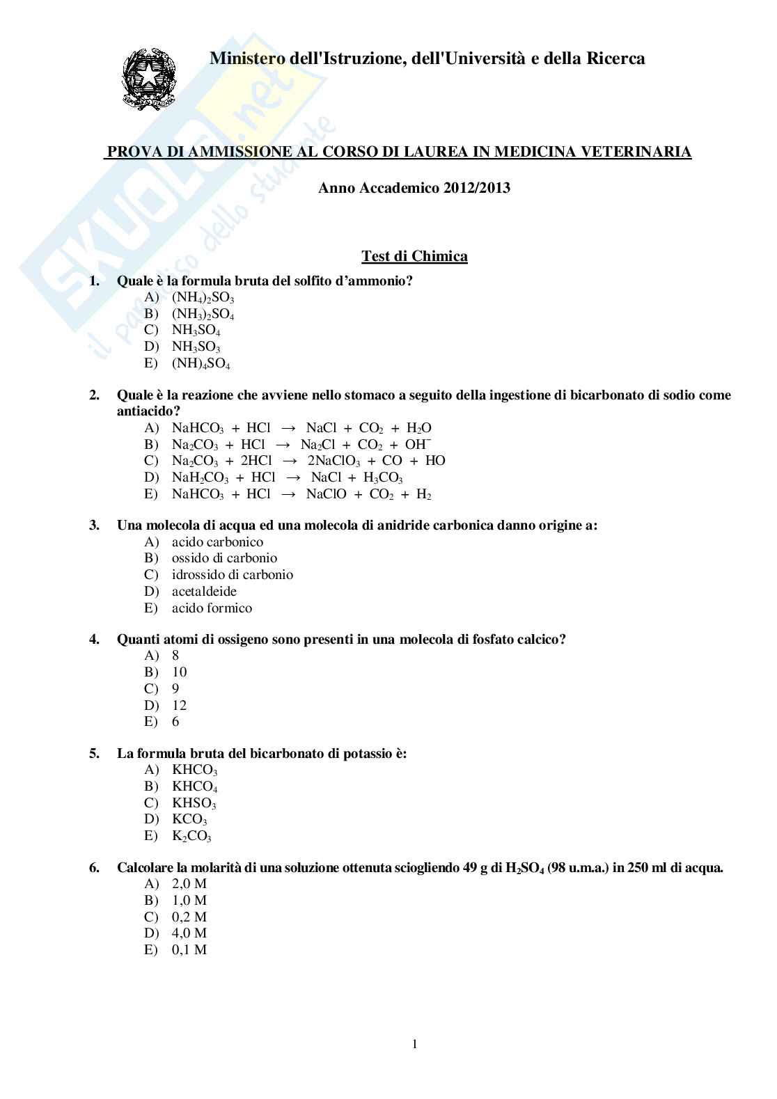 Scarica il test di Ammissione a Veterinaria anno 2012 formato PDF
