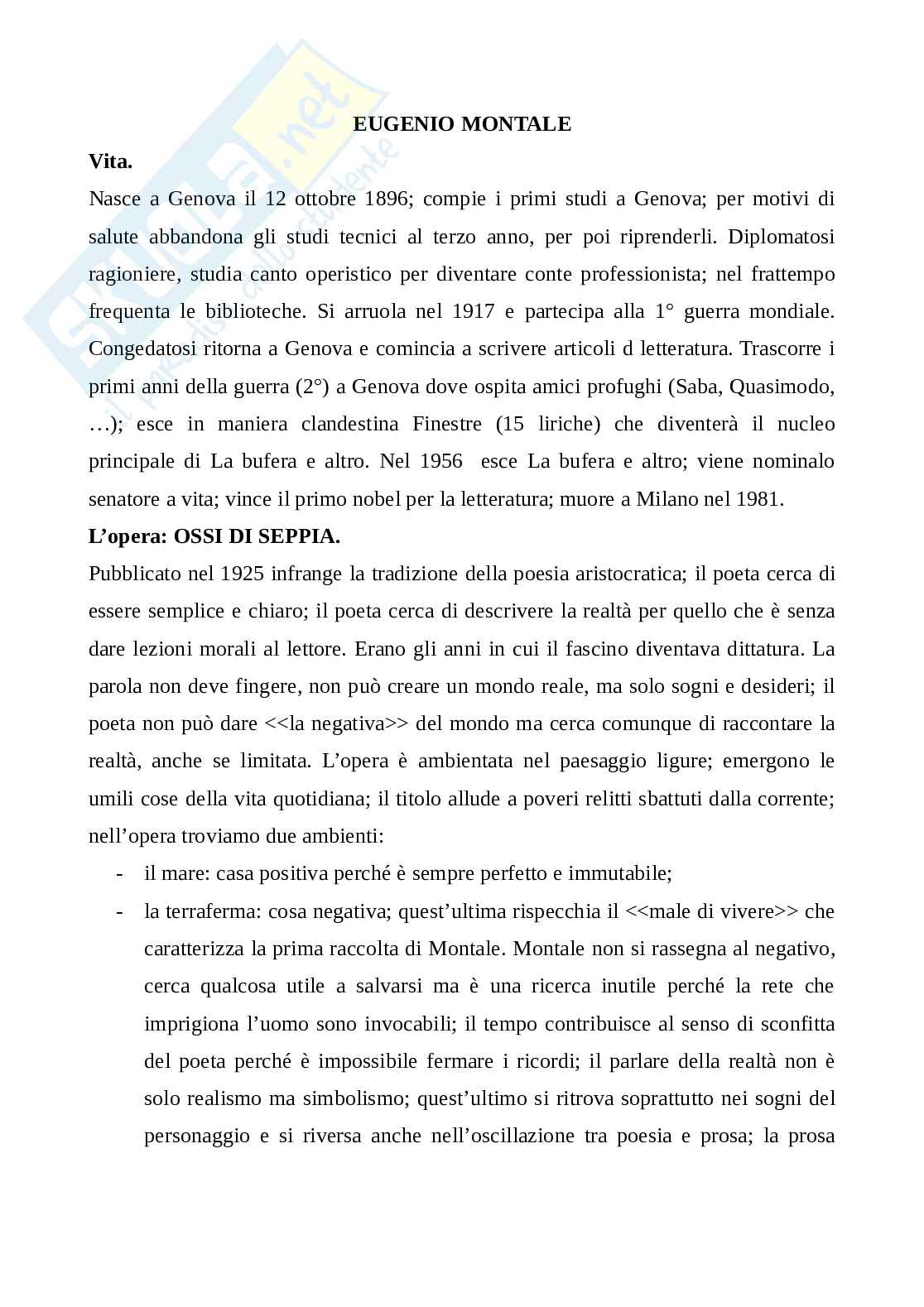 Eugenio Montale nasce a Genova il 12 ottobre 1896; compie i primi studi a Genova; per motivi di salute abbandona gli studi tecnici al terzo anno, per poi riprenderli. Diplomatosi ragioniere, studia canto operistico per diventare cantante professionista; nel frattempo frequenta le biblioteche. Si arruola nel 1917 e partecipa alla Prima Guerra Monsdiale. Congedatosi, Eugenio Montale ritorna a Genova e comincia a scrivere articoli d letteratura. Trascorre i primi anni della Seconda Guerra Mondiale a Genova dove ospita amici profughi (Saba, Quasimodo, ecc...); esce in maniera clandestina Finestre (15 liriche) che diventerà il nucleo principale di La bufera e altro. Nel 1956 esce la raccolta poetica La bufera e altro; Montale viene nominato senatore a vita; nel 1975 vince il premio Nobel per la letteratura; l'intellettuale italiano muore a Milano nel 1981.