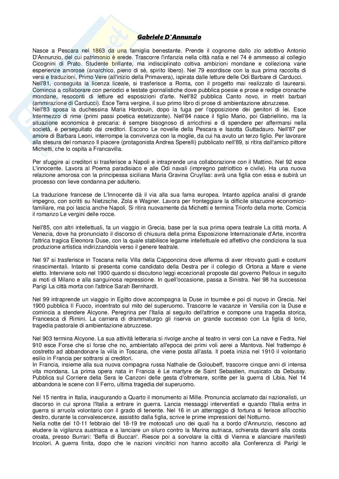 Nasce a Pescara nel 1863 da una famiglia benestante. Prende il cognome dallo zio adottivo Antonio D'Annunzio, del cui patrimonio è erede. Trascorre l'infanzia nella città natia e nel 74 è ammesso al collegio Cicognini di Prato. Studente brillante, ma indisciplinato coltiva ambizioni mondane e colleziona varie esperienze amorose (anarchico, pieno di sè, spirito libero). Nel 79 esordisce con la sua prima raccolta di versi e traduzioni, Primo Vere (all'inizio della Primavera), ispirata dalle letture delle Odi Barbare di Carducci.