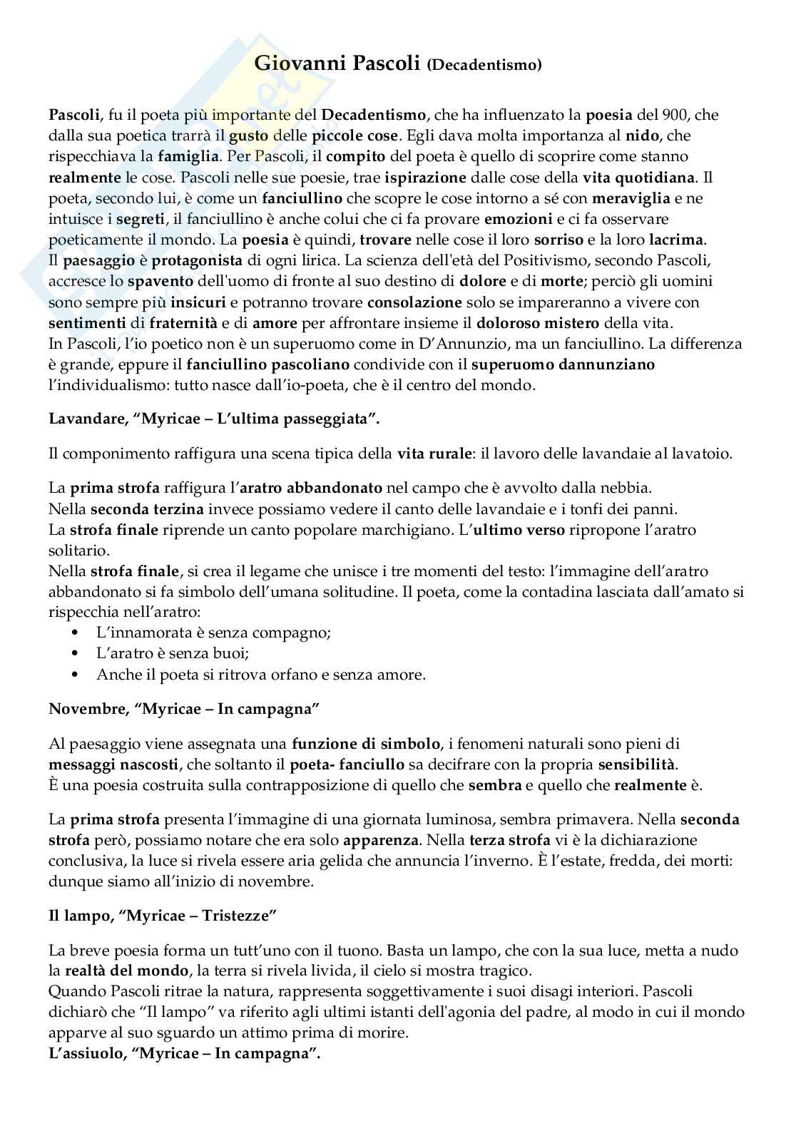 Pascoli, fu il poeta più importante del Decadentismo, che ha influenzato la poesia del 900, che dalla sua poetica trarrà il gusto delle piccole cose. Egli dava molta importanza al nido, che rispecchiava la famiglia. Per Pascoli, il compito del poeta è quello di scoprire come stanno realmente le cose. Pascoli nelle sue poesie, trae ispirazione dalle cose della vita quotidiana. Il poeta, secondo lui, è come un fanciullino che scopre le cose intorno a sé con meraviglia e ne intuisce i segreti, il fanciullino è anche colui che ci fa provare emozioni e ci fa osservare poeticamente il mondo. La poesia è quindi, trovare nelle cose il loro sorriso e la loro lacrima.