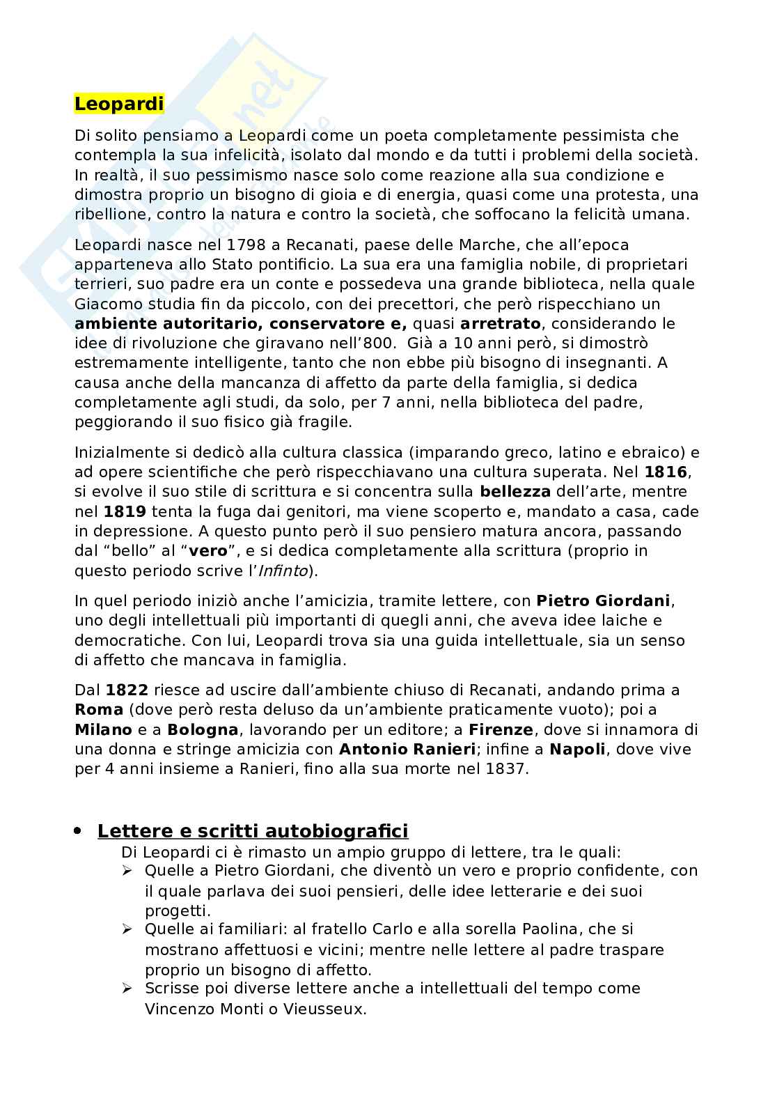 Leopardi nasce nel 1798 a Recanati, paese delle Marche, che all’epoca apparteneva allo Stato pontificio. La sua era una famiglia nobile, di proprietari terrieri, suo padre era un conte e possedeva una grande biblioteca, nella quale Giacomo studia fin da piccolo, con dei precettori, che però rispecchiano un ambiente autoritario, conservatore e, quasi arretrato, considerando le idee di rivoluzione che giravano nell’800. Già a 10 anni però, si dimostrò estremamente intelligente, tanto che non ebbe più bisogno di insegnanti. A causa anche della mancanza di affetto da parte della famiglia, si dedica completamente agli studi, da solo, per 7 anni, nella biblioteca del padre, peggiorando il suo fisico già fragile.