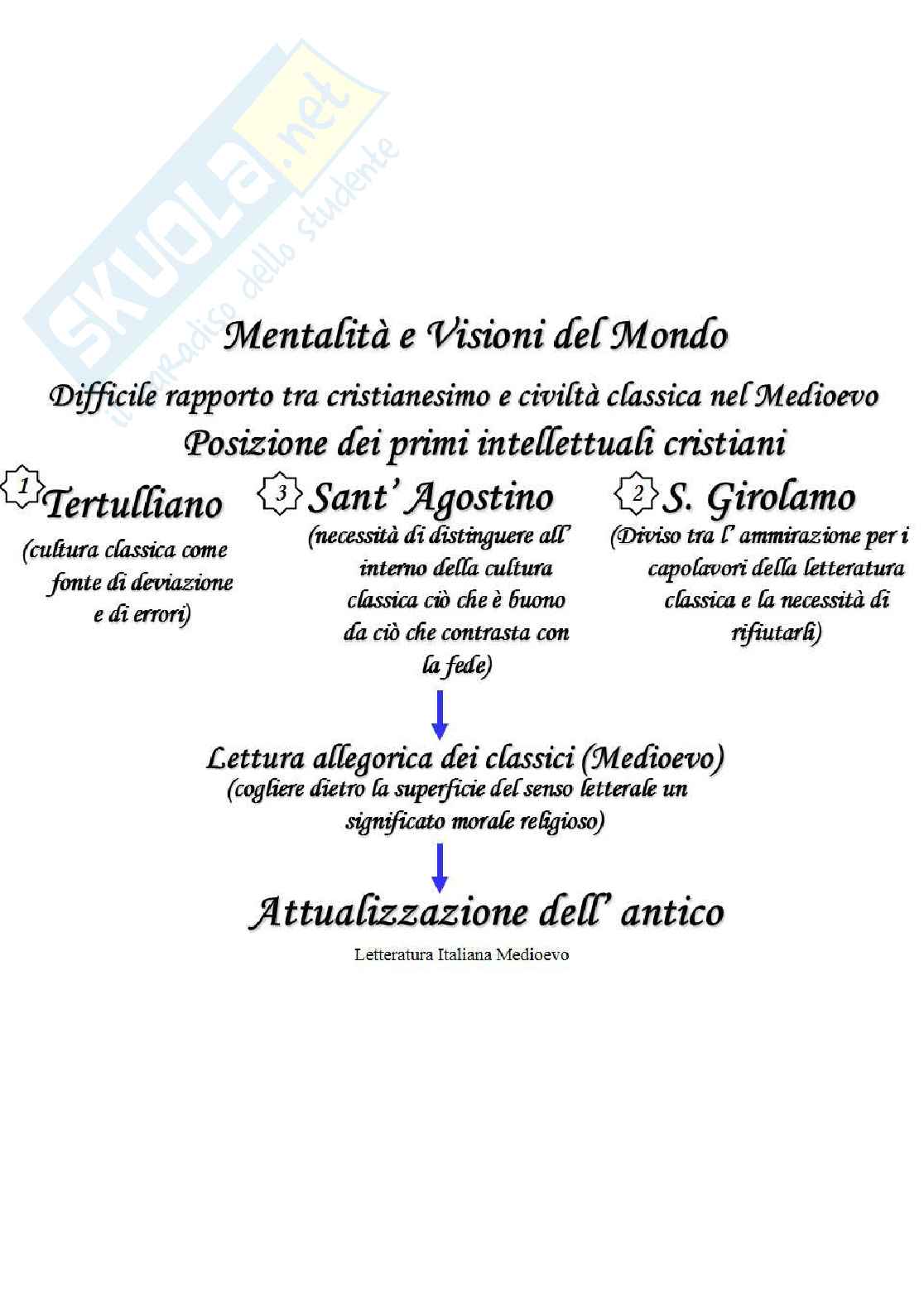 Lo schema contenuto nell'allegato riassume le posizioni, nei confronti della cultura classica pre-cristiana, di tre importanti padri della chiesa : Tertulliano, Sant'Agostino e San Girolamo.