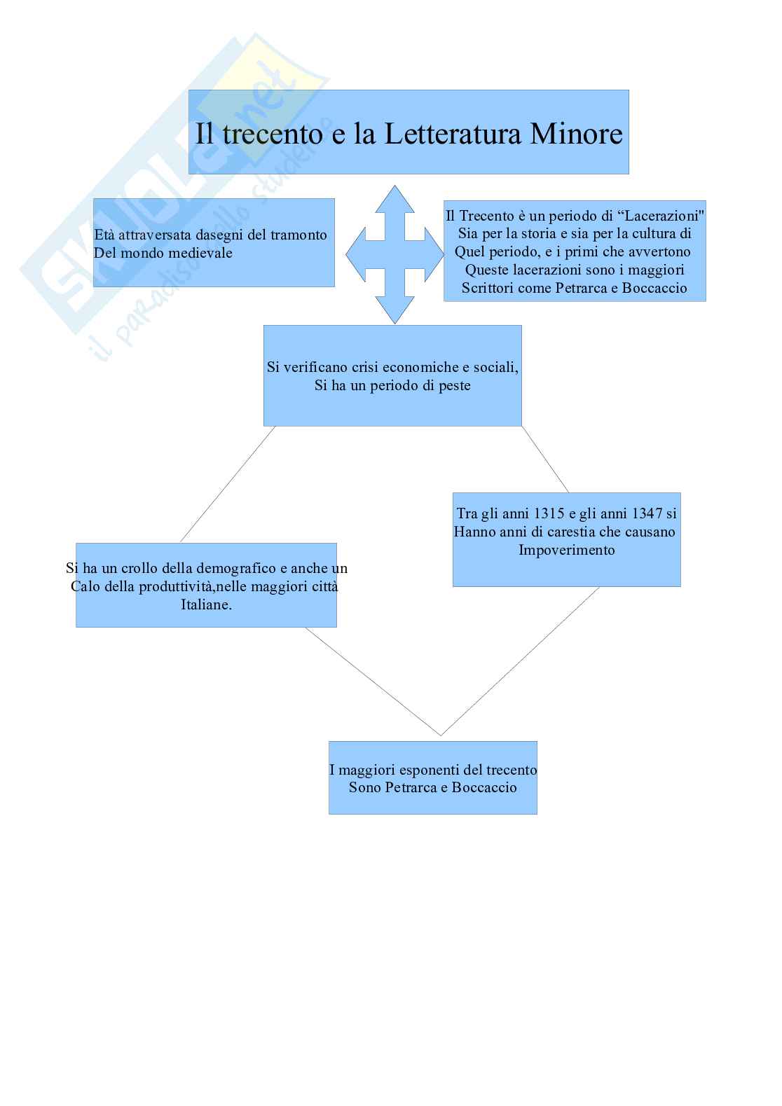 Il Trecento è stato un periodo di frattura, sia dal punto di vista storico, sia dal punto di vista culturale. Gli autori che hanno avvertito questa frattura e che costituiscono i principali esponenti della letteratura del Quattordicesimo secolo sono: Giovanni Boccaccio e Francesco Petrarca. Di seguito viene trattata una Mappa concettuale poesia di questi autori.