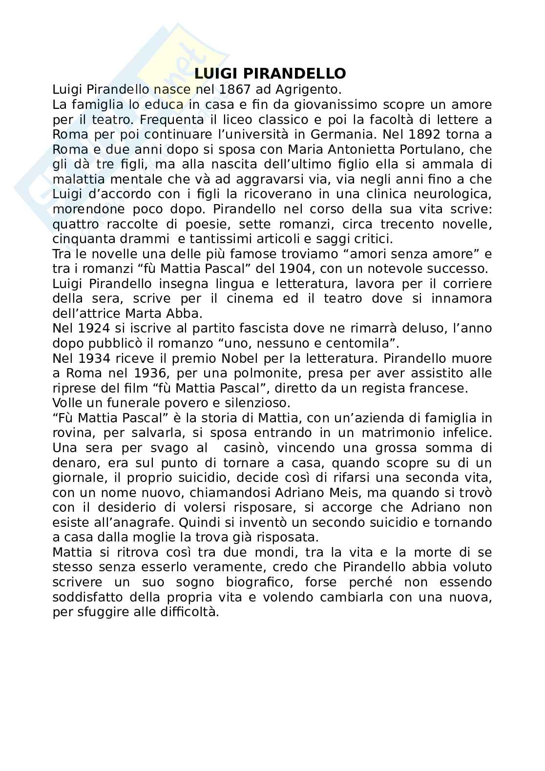 La famiglia lo educa in casa e fin da giovanissimo scopre un amore per il teatro. Frequenta il liceo classico e poi la facoltà di lettere a Roma per poi continuare l’università in Germania. Nel 1892 torna a Roma e due anni dopo si sposa con Maria Antonietta Portulano, che gli dà tre figli, ma alla nascita dell’ultimo figlio ella si ammala di malattia mentale che và ad aggravarsi via, via negli anni fino a che Luigi d’accordo con i figli la ricoverano in una clinica neurologica, morendone poco dopo. Pirandello nel corso della sua vita scrive: quattro raccolte di poesie, sette romanzi, circa trecento novelle, cinquanta drammi e tantissimi articoli e saggi critici.