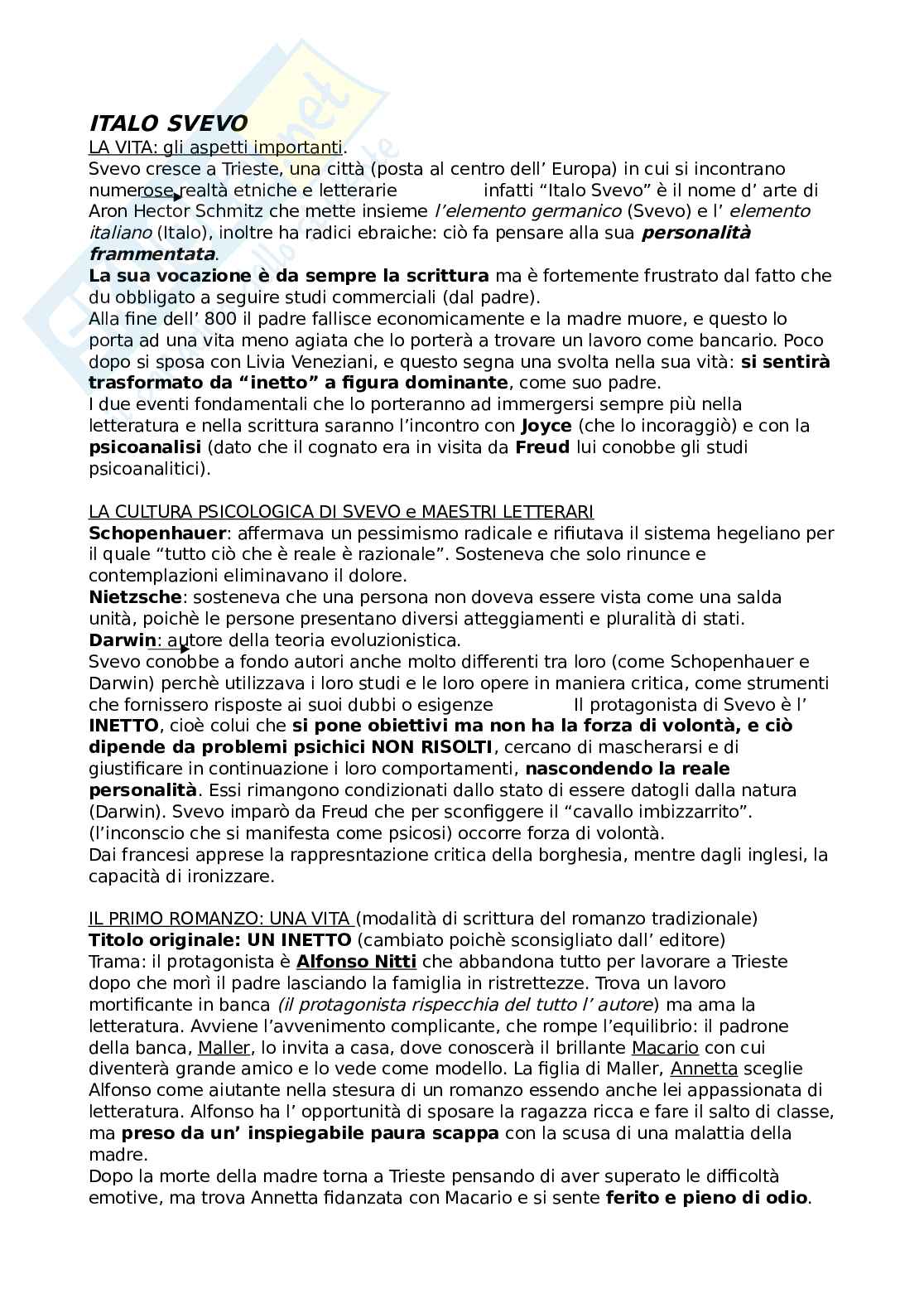 Svevo conobbe a fondo autori anche molto differenti tra loro (come Schopenhauer e Darwin) perchè utilizzava i loro studi e le loro opere in maniera critica, come strumenti che fornissero risposte ai suoi dubbi o esigenze Il protagonista di Svevo è l’ inetto, cioè colui che si pone obiettivi ma non ha la forza di volontà, e ciò dipende da problemi psichici non risolti, cercano di mascherarsi e di giustificare in continuazione i loro comportamenti, nascondendo la reale personalità. Essi rimangono condizionati dallo stato di essere datogli dalla natura (Darwin). Svevo imparò da Freud che per sconfiggere il “cavallo imbizzarrito”. (l’inconscio che si manifesta come psicosi) occorre forza di volontà.