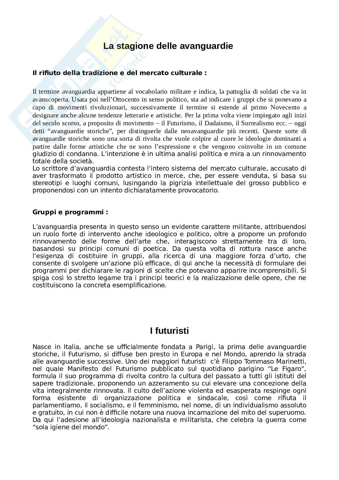 Nasce in Italia, anche se ufficialmente fondata a Parigi, la prima delle avanguardie storiche, il Futurismo, si diffuse ben presto in Europa e nel Mondo, aprendo la strada alle avanguardie successive. Uno dei maggiori futuristi c’è Filippo Tommaso Marinetti, nel quale Manifesto del Futurismo pubblicato sul quotidiano parigino “Le Figaro”, formula il suo programma di rivolta contro la cultura del passato a tutti gli istituti del sapere tradizionale, proponendo un azzeramento su cui elevare una concezione della vita integralmente rinnovata. Il culto dell’azione violenta ed esasperata respinge ogni forma esistente di organizzazione politica e sindacale, così come rifiuta il parlamentiamo, il socialismo, e il femminismo, nel nome, di un individualismo assoluto e gratuito, in cui non è difficile notare una nuova incarnazione del mito del superuomo. Da qui l’adesione all’ideologia nazionalista e militarista, che celebra la guerra come “sola igiene del mondo”.
