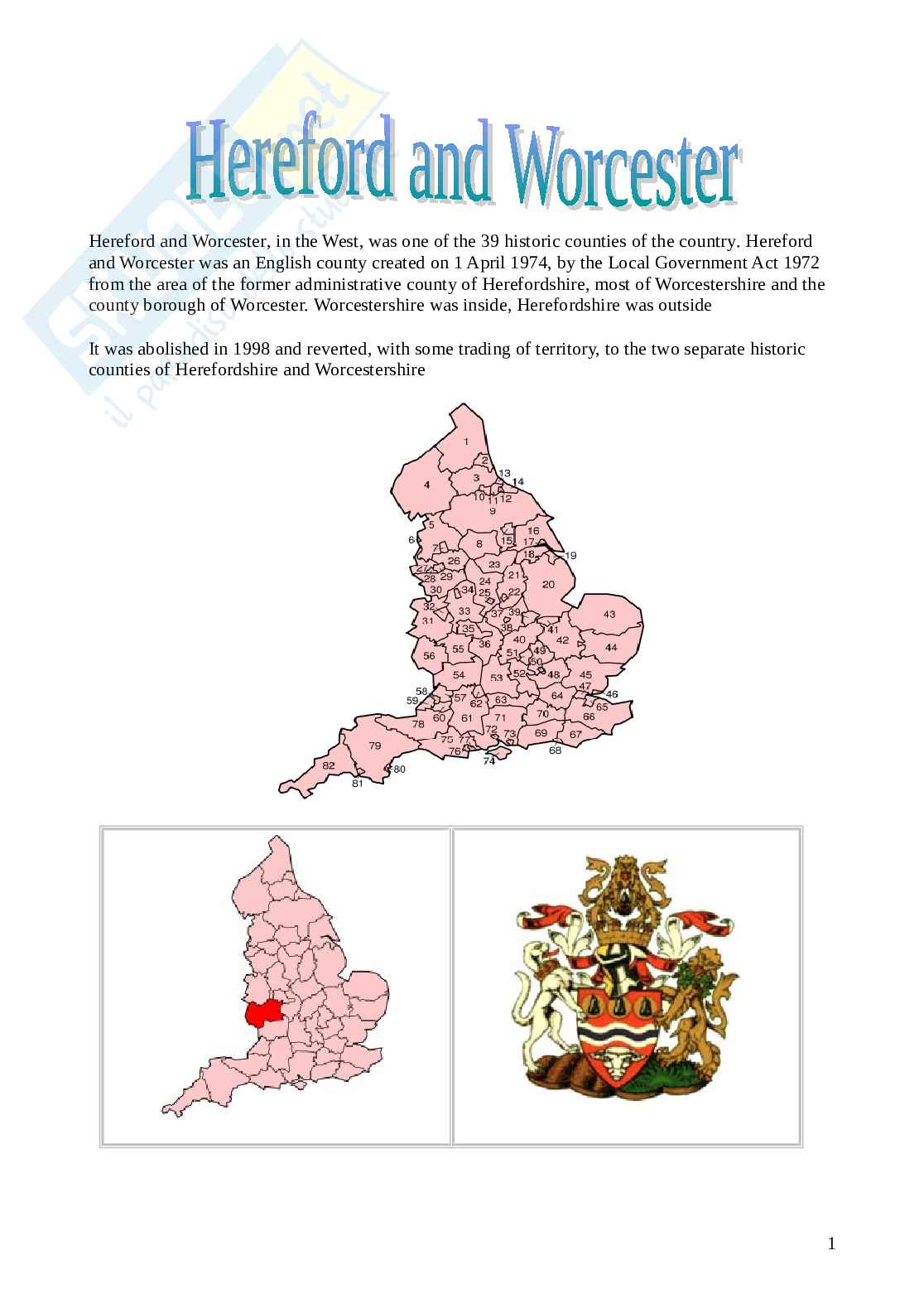 Hereford and Worcester, in the West, was one of the 39 historic counties of the country. Hereford and Worcester was an English county created on 1 April 1974, by the Local Government Act 1972 from the area of the former administrative county of Herefordshire, most of Worcestershire and the county borough of Worcester. Worcestershire was inside, Herefordshire was outside