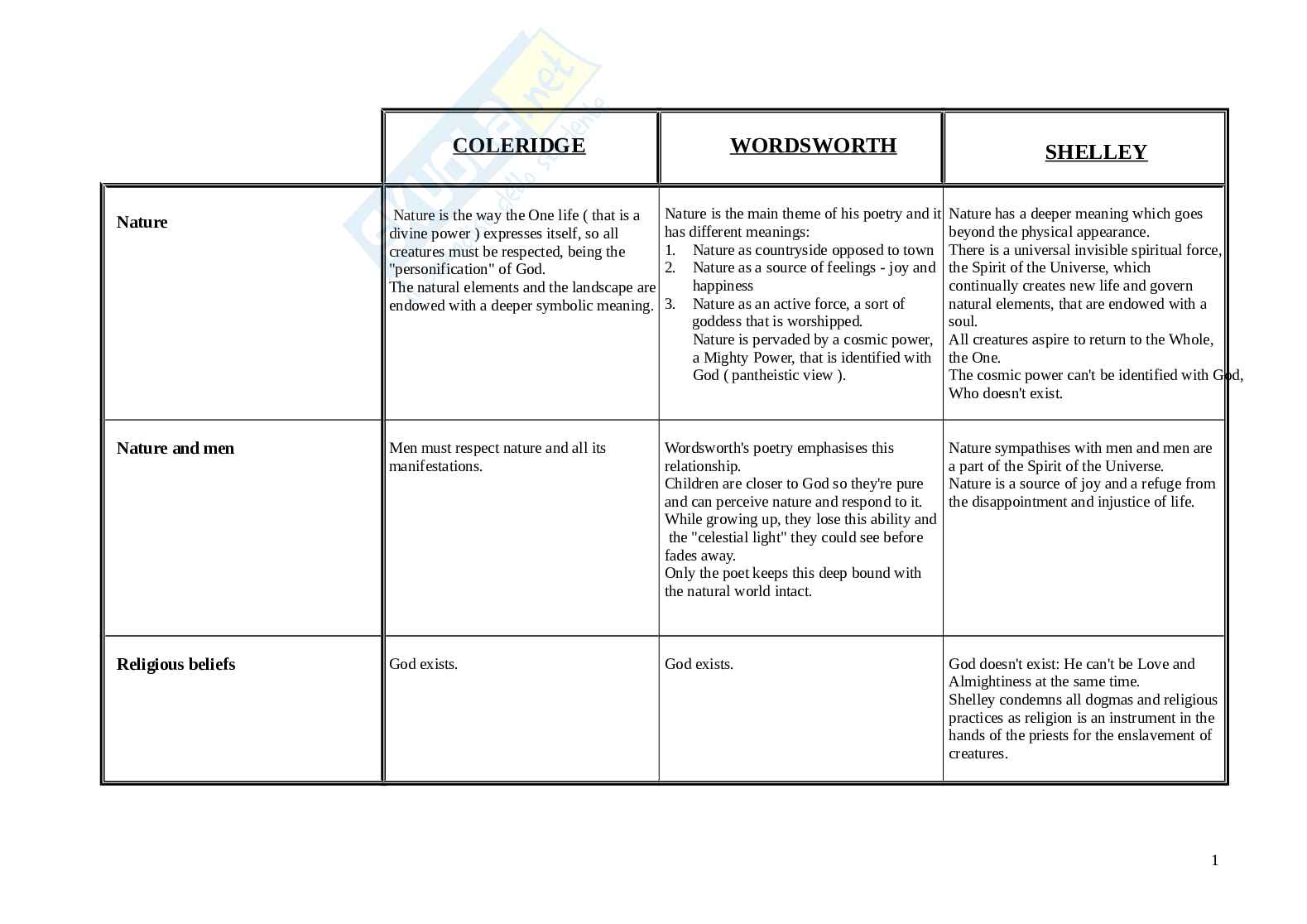 Other comparisons among Coleridge, Wordsworth and Shelley are into the attached file: a table that explains Religious beliefs, Political and philosophical influences, Social involvement, poetry and imagination.