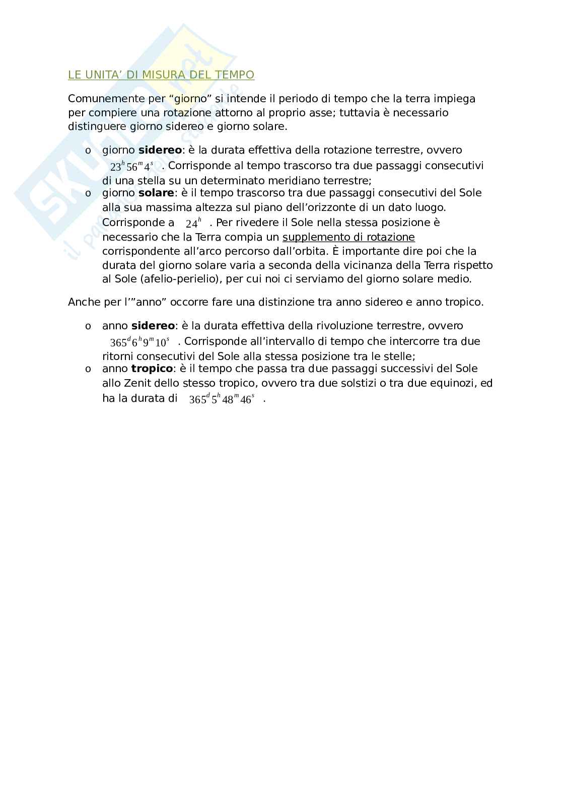 - giorno solare: è il tempo trascorso tra due passaggi consecutivi del Sole alla sua massima altezza sul piano dell’orizzonte di un dato luogo. Corrisponde a 〖24〗^h. Per rivedere il Sole nella stessa posizione è necessario che la Terra compia un supplemento di rotazione corrispondente all’arco percorso dall’orbita. È importante dire poi che la durata del giorno solare varia a seconda della vicinanza della Terra rispetto al Sole (afelio-perielio), per cui noi ci serviamo del giorno solare medio.