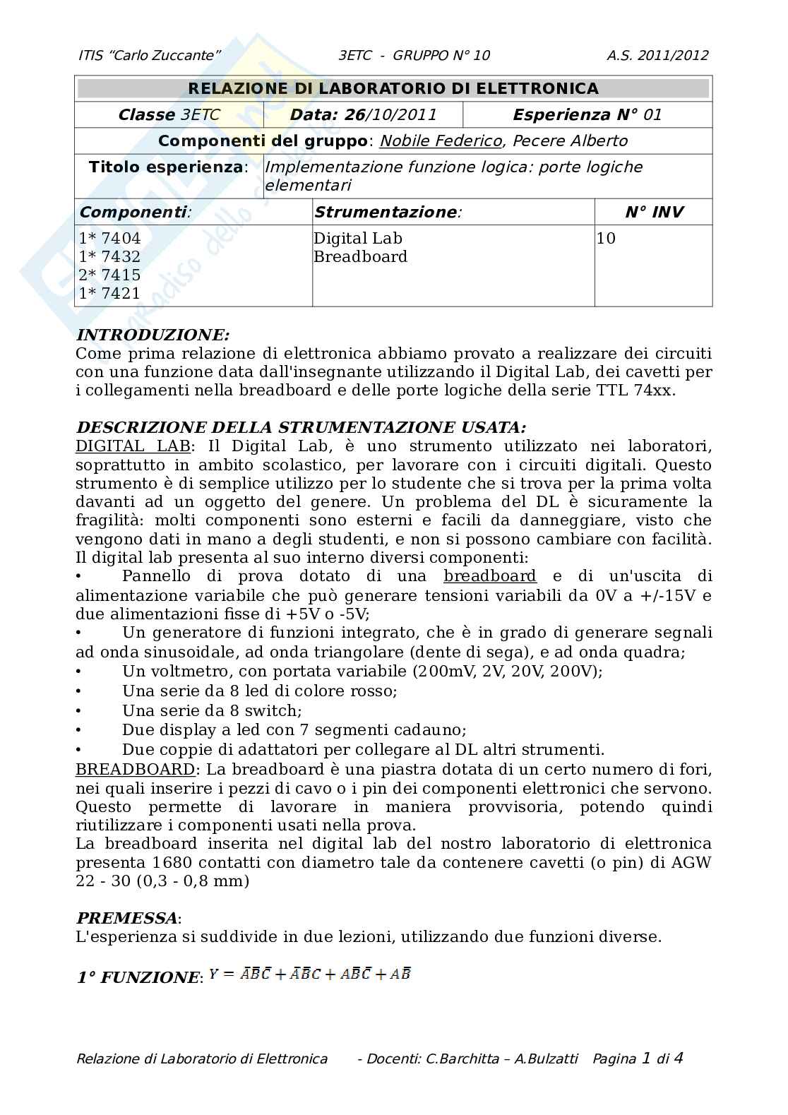 Esperienza di laboratorio, corredata di tabelle, nella quale vengono descritti i metodi di realaizzazione di una semplice funzione loica elementare, con anche un approfindimento nello strumento DIGITAL LAB - IDL 800.