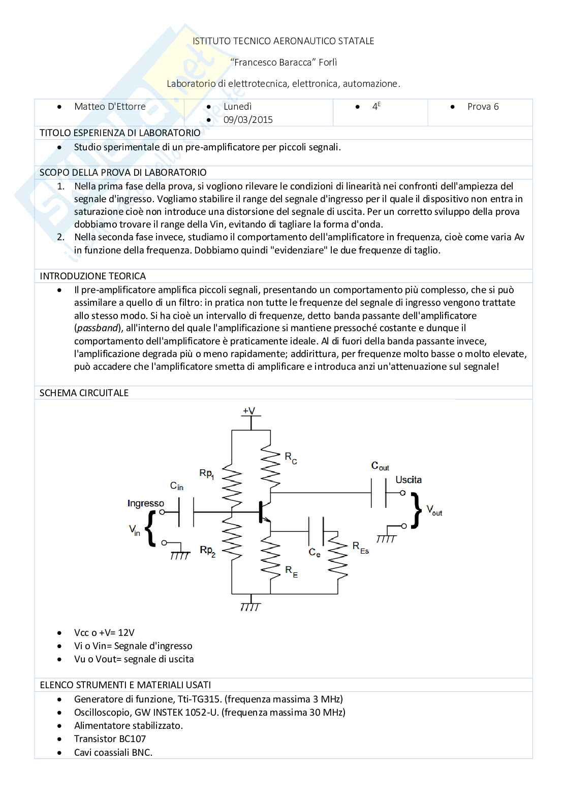 Studio sperimentale di un pre-amplificatore per piccoli segnali.