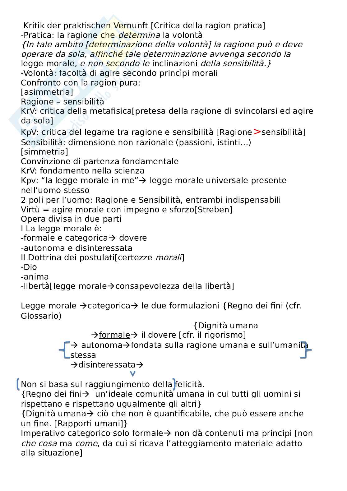 Appunto di filosofia moderna che, in allegato, fornisce una descrizione sintetica dell'opera Critica della ragion pratica.
