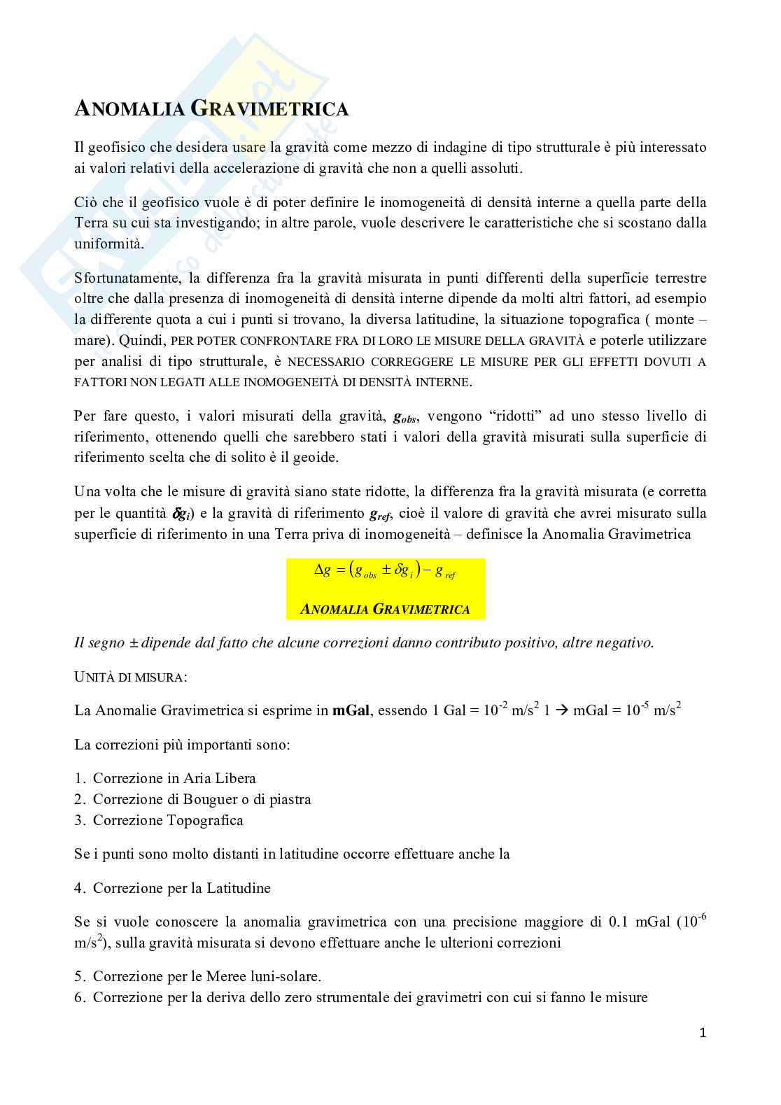 Una volta che le misure di gravità siano state ridotte, la differenza fra la gravità misurata (e corretta per le quantità gi) e la gravità di riferimento gref, cioè il valore di gravità che avrei misurato sulla superficie di riferimento in una Terra priva di inomogeneità, definisce l'Anomalia Gravimetrica.