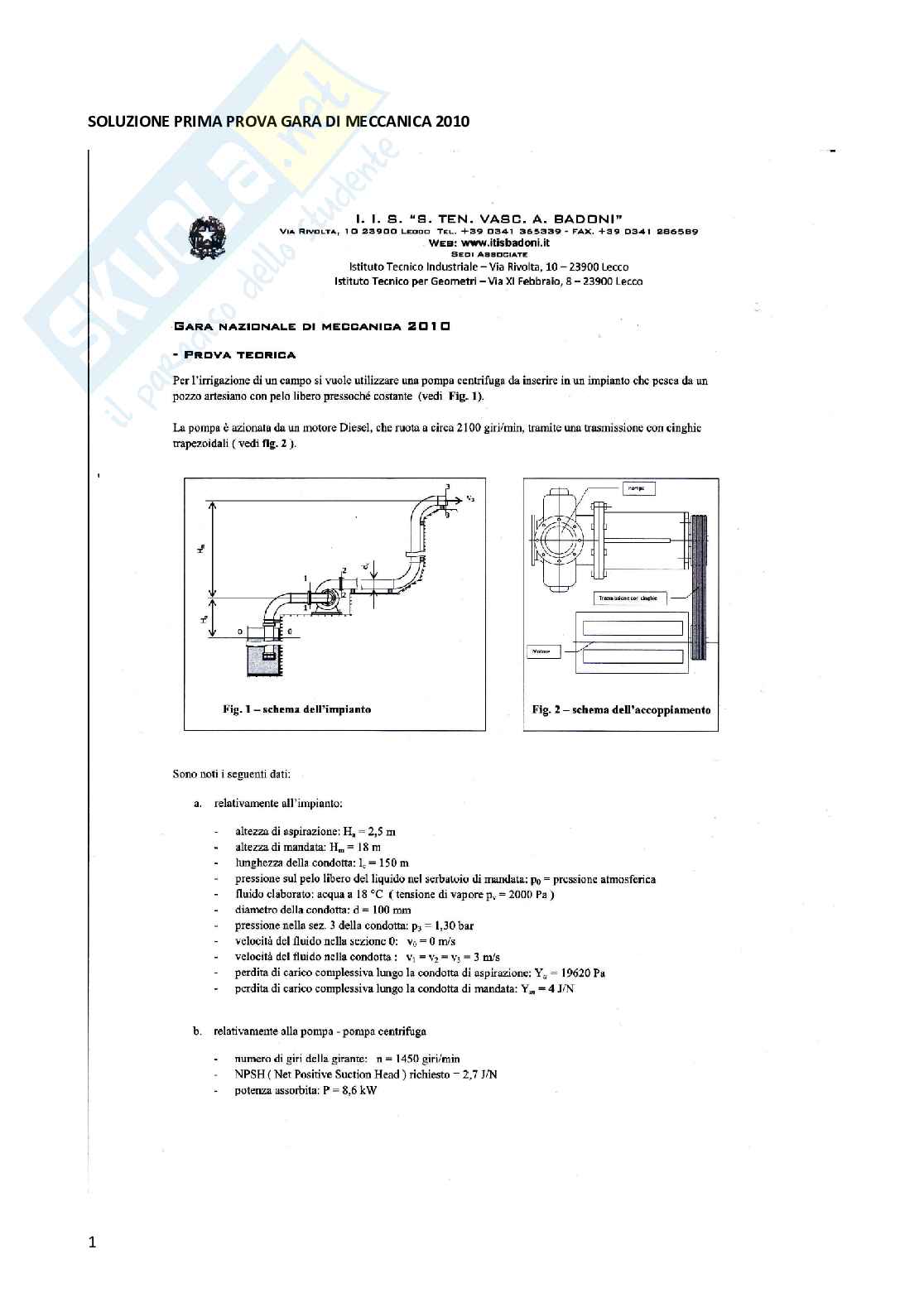 Lo svolgimento del tema si articola con il calcolo della portata della pompa centrifuga, la pressione di ingresso e di uscita del fluido della girante, la prevalenza manometrica, il rendimento della pompa, e infine la verifica dell'altezza di aspirazione rispetto al rischio della cavitazione.