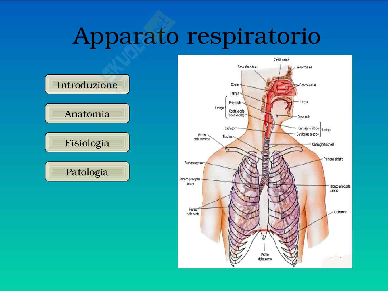 Apparato respiratorio funzioni: La respirazione viene generalmente definita come la funzione mediante la quale gli esseri viventi assumono ossigeno dall'ambiente esterno ed eliminano anidride carbonica e vapore acqueo. La respirazione tuttavia non consiste soltanto in uno scambio gassoso fra l'organismo e l'ambiente: con l'introduzione dell'ossigeno comincia un complesso processo che, attraverso una serie di reazioni che si svolgono direttamente nelle cellule, porta alla demolizione di sostanze organiche con conseguente liberazione di energia chimica (indispensabile per tutti i processi vitali ) e eliminazione di anidride carbonica e acqua come prodotti di scarto. L'ossigeno ha dunque una duplice funzione: