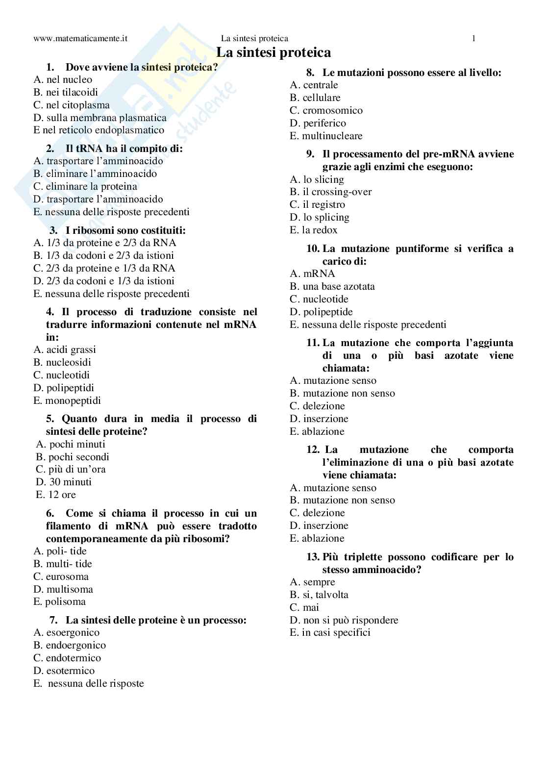 1. Dove avviene la sintesi proteica? 8. Le mutazioni possono essere al livello: