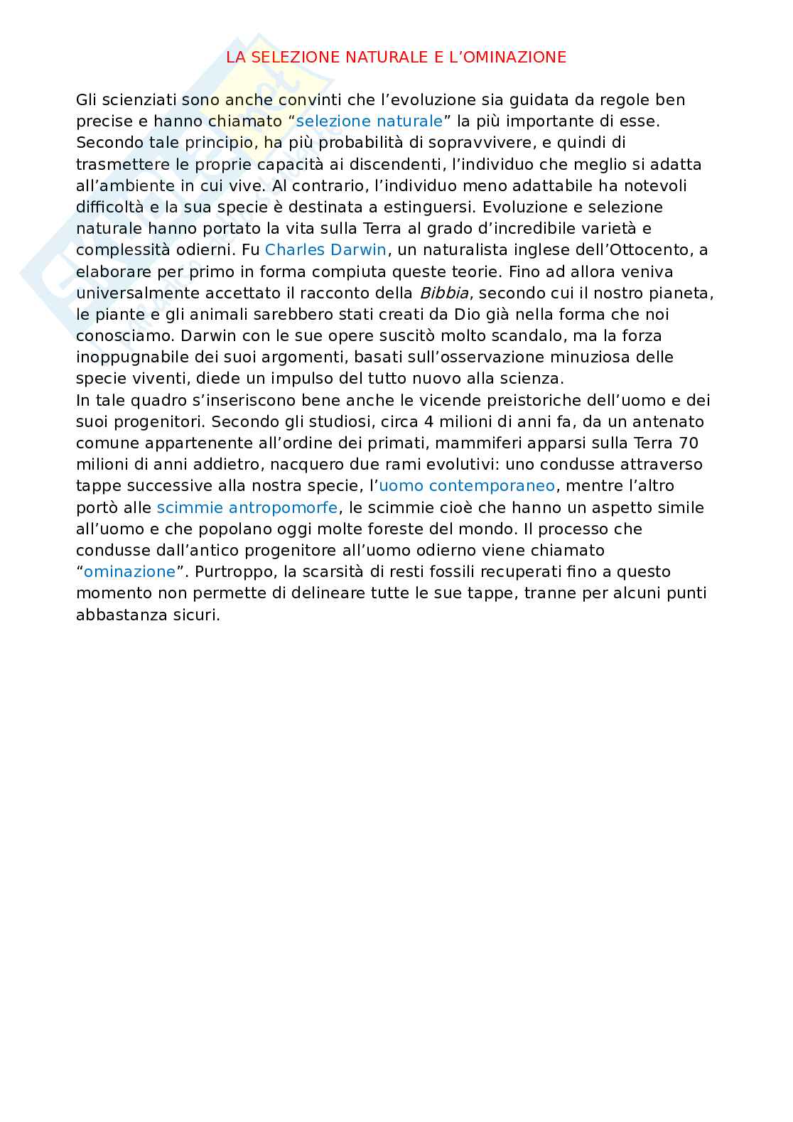 In tale quadro s’inseriscono bene anche le vicende preistoriche dell’uomo e dei suoi progenitori. Secondo gli studiosi, circa 4 milioni di anni fa, da un antenato comune appartenente all’ordine dei primati, mammiferi apparsi sulla Terra 70 milioni di anni addietro, nacquero due rami evolutivi: uno condusse attraverso tappe successive alla nostra specie, l’uomo contemporaneo, mentre l’altro portò alle scimmie antropomorfe, le scimmie cioè che hanno un aspetto simile all’uomo e che popolano oggi molte foreste del mondo. Il processo che portò dall’antico progenitore all’uomo odierno e noto come “ominazione”. Sfortunatamente la scarsità di resti fossili che sono stati recuperati fino a oggi non permette di delineare tutte le sue tappe, tranne per alcuni punti abbastanza sicuri.