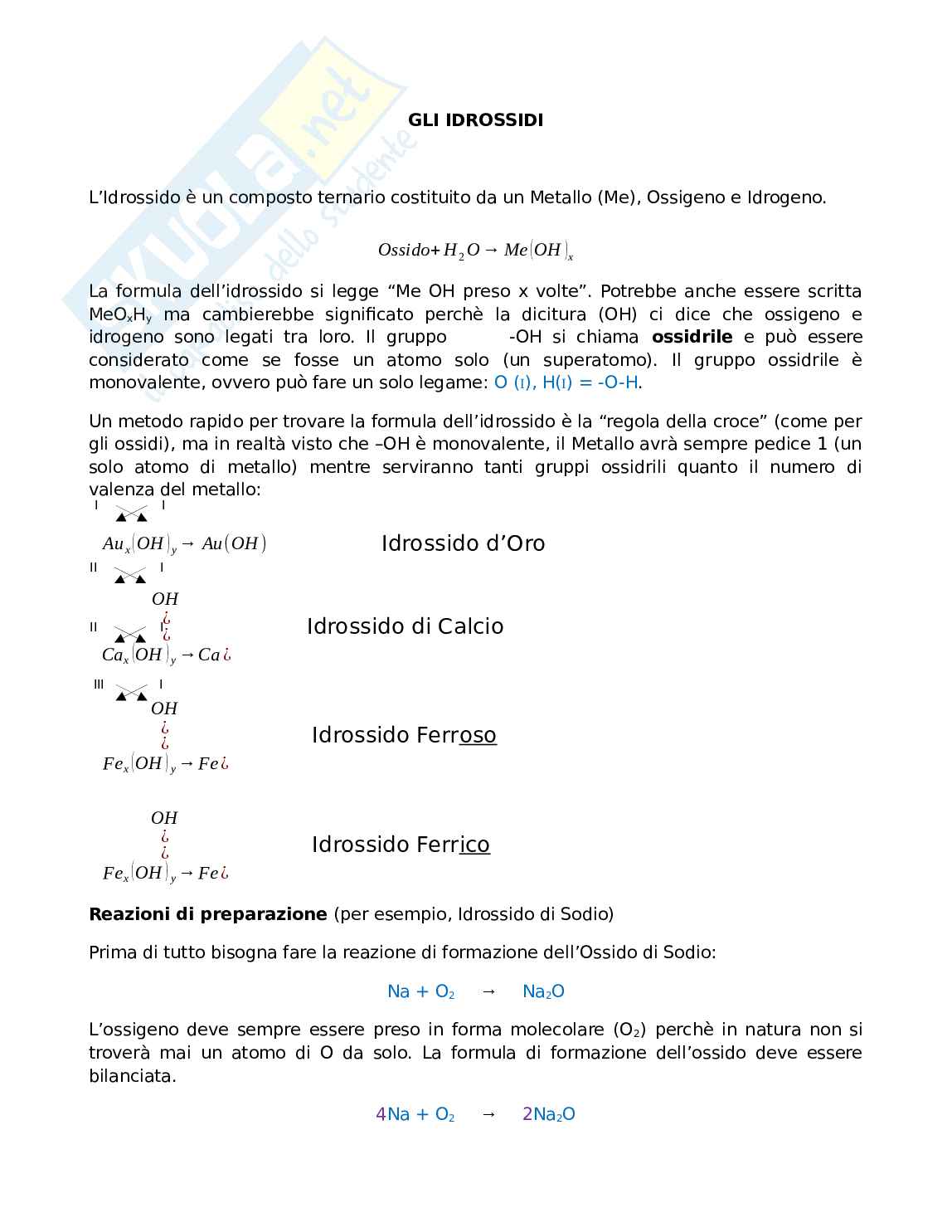 Un metodo rapido per trovare la formula dell’idrossido è la “regola della croce” (come per gli ossidi), ma in realtà visto che –OH è monovalente, il Metallo avrà sempre pedice 1 (un solo atomo di metallo) mentre serviranno tanti gruppi ossidrili quanto il numero di valenza del metallo.