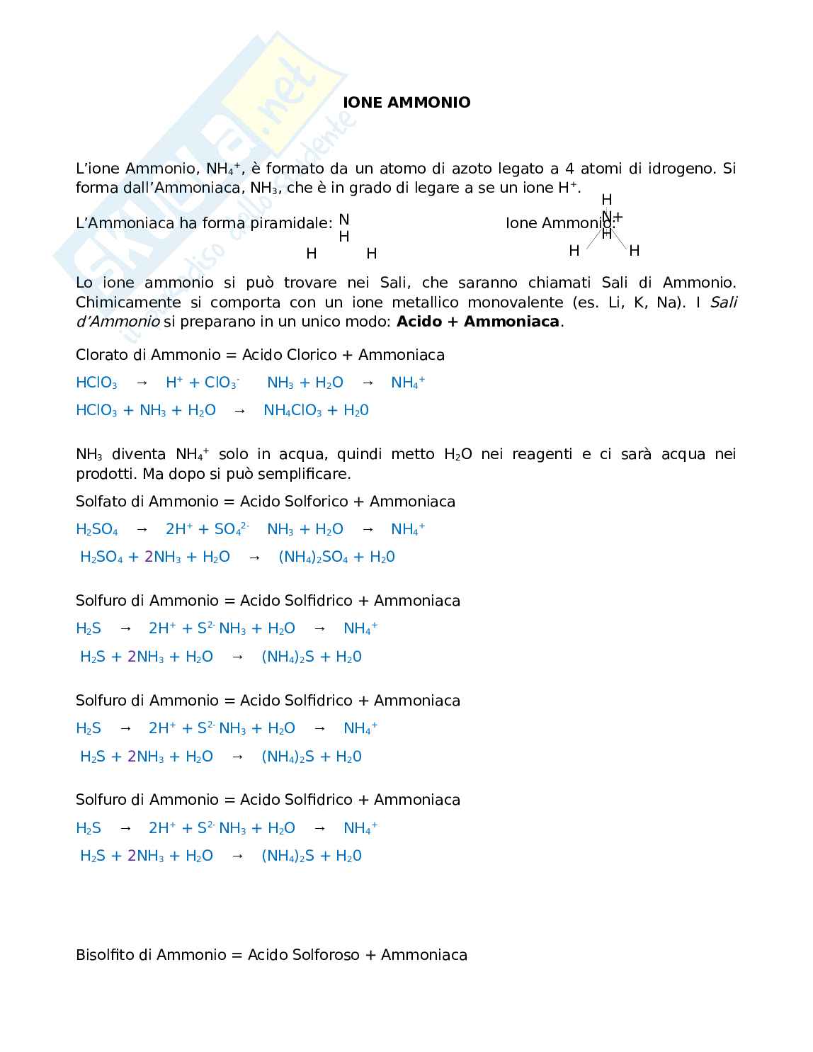 Lo ione ammonio si può trovare nei Sali, che saranno chiamati Sali di Ammonio.