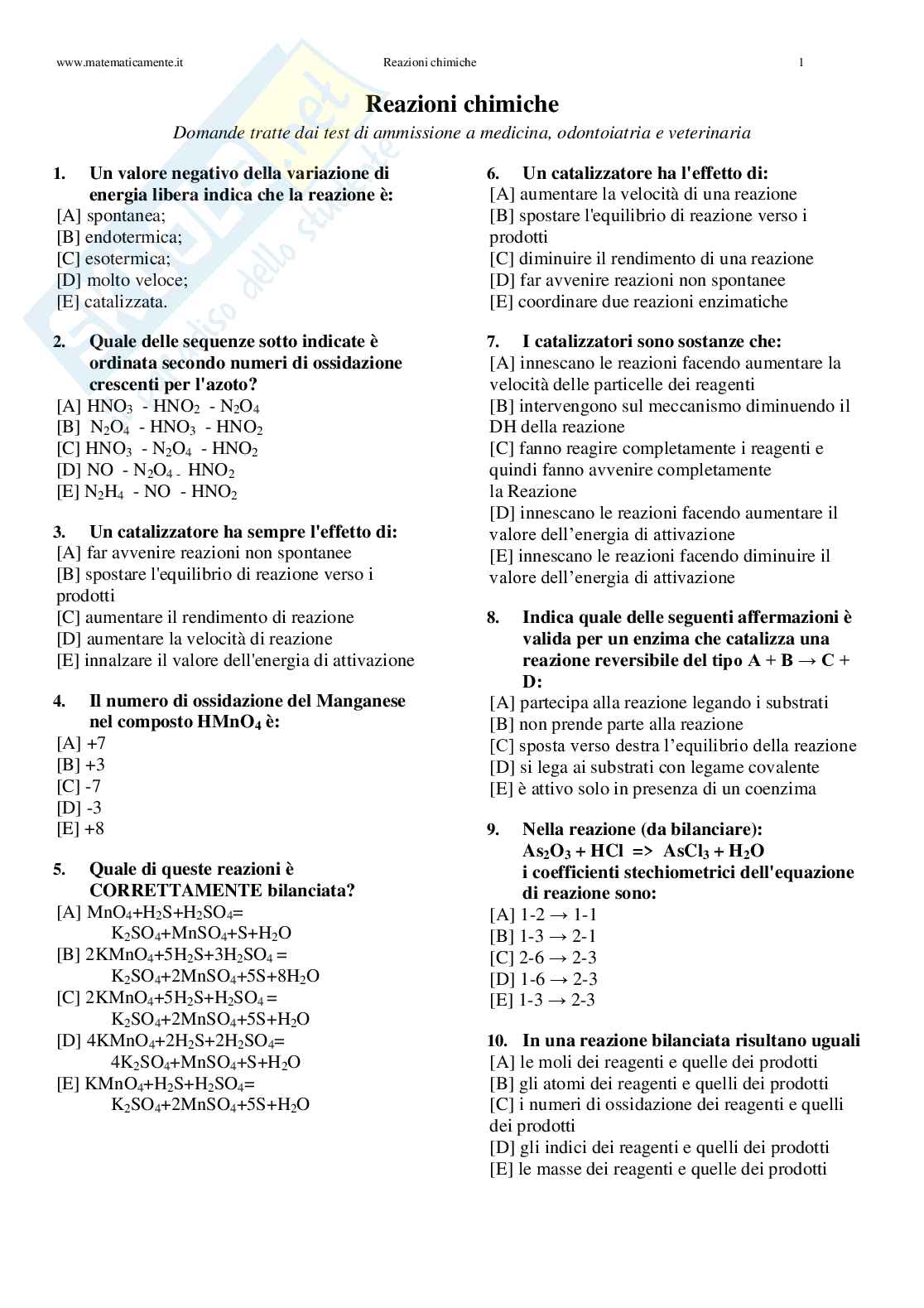 [A] 0,125 Indicare l’unica equazione bilanciata: