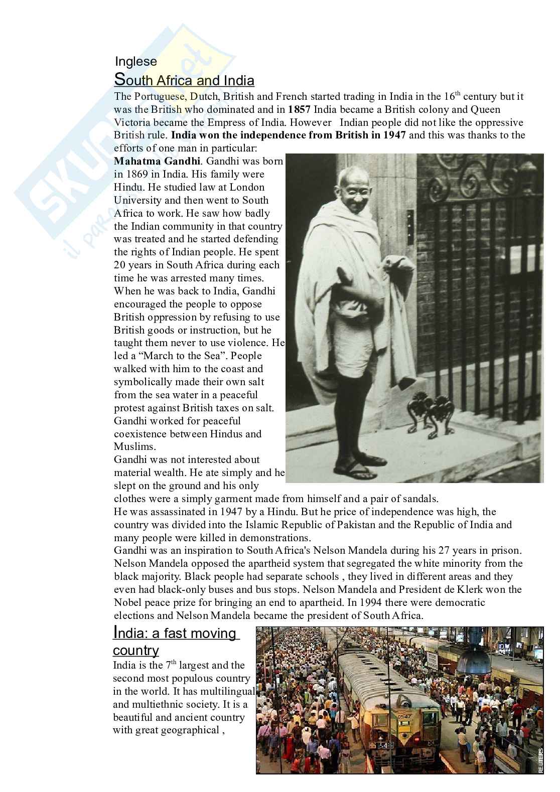 efforts of one man in particular: Mahatma Gandhi. Gandhi was born in 1869 in India. His family were Hindu. He studied law at London University and then went to South Africa to work. He saw how badly the Indian community in that country was treated and he started defending the rights of Indian people.