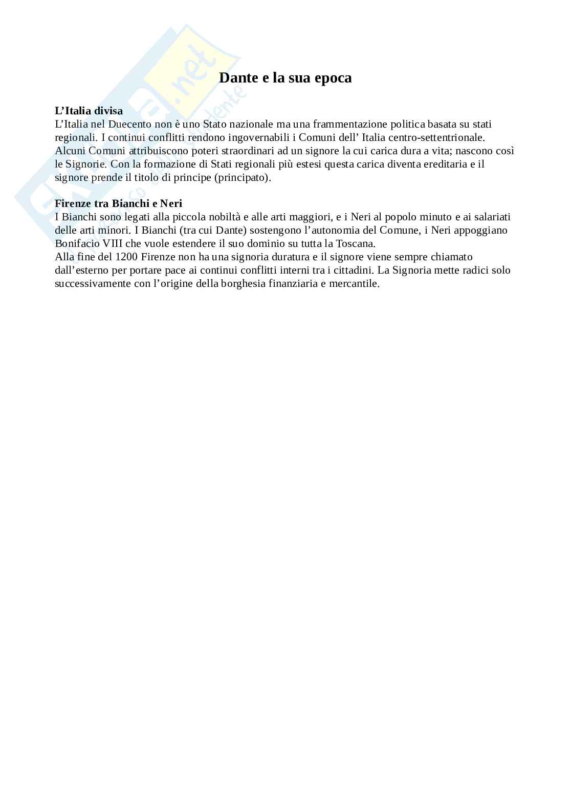 I Bianchi sono legati alla piccola nobiltà e alle arti maggiori, e i Neri al popolo minuto e ai salariati delle arti minori. I Bianchi (tra cui Dante) sostengono l’autonomia del Comune, i Neri appoggiano Bonifacio VIII che vuole estendere il suo dominio su tutta la Toscana.