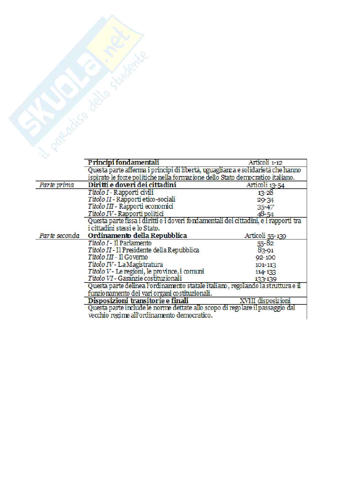 La Costituzione della Repubblica italiana è suddivisa in due parti, precedute dai Principi fondamentali, e comprende 139 articoli e 18 disposizioni transitorie e finali.
