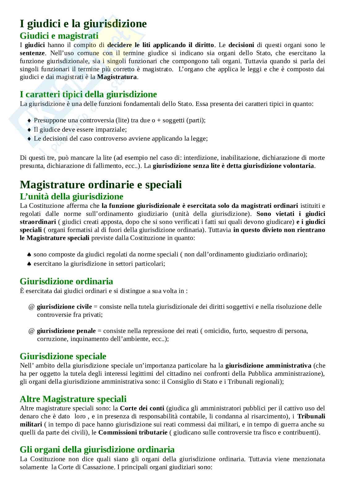 La Costituzione afferma che la funzione giurisdizionale è esercitata solo da magistrati ordinari istituiti e regolati dalle norme sull’ordinamento giudiziario (unità della giurisdizione). Sono vietati i giudici straordinari ( giudici creati apposta, dopo che si sono verificati i fatti sui quali devono giudicare) e i giudici speciali ( organi formatisi al di fuori della giurisdizione ordinaria). Tuttavia in questo divieto non rientrano le Magistrature speciali previste dalla Costituzione in quanto: