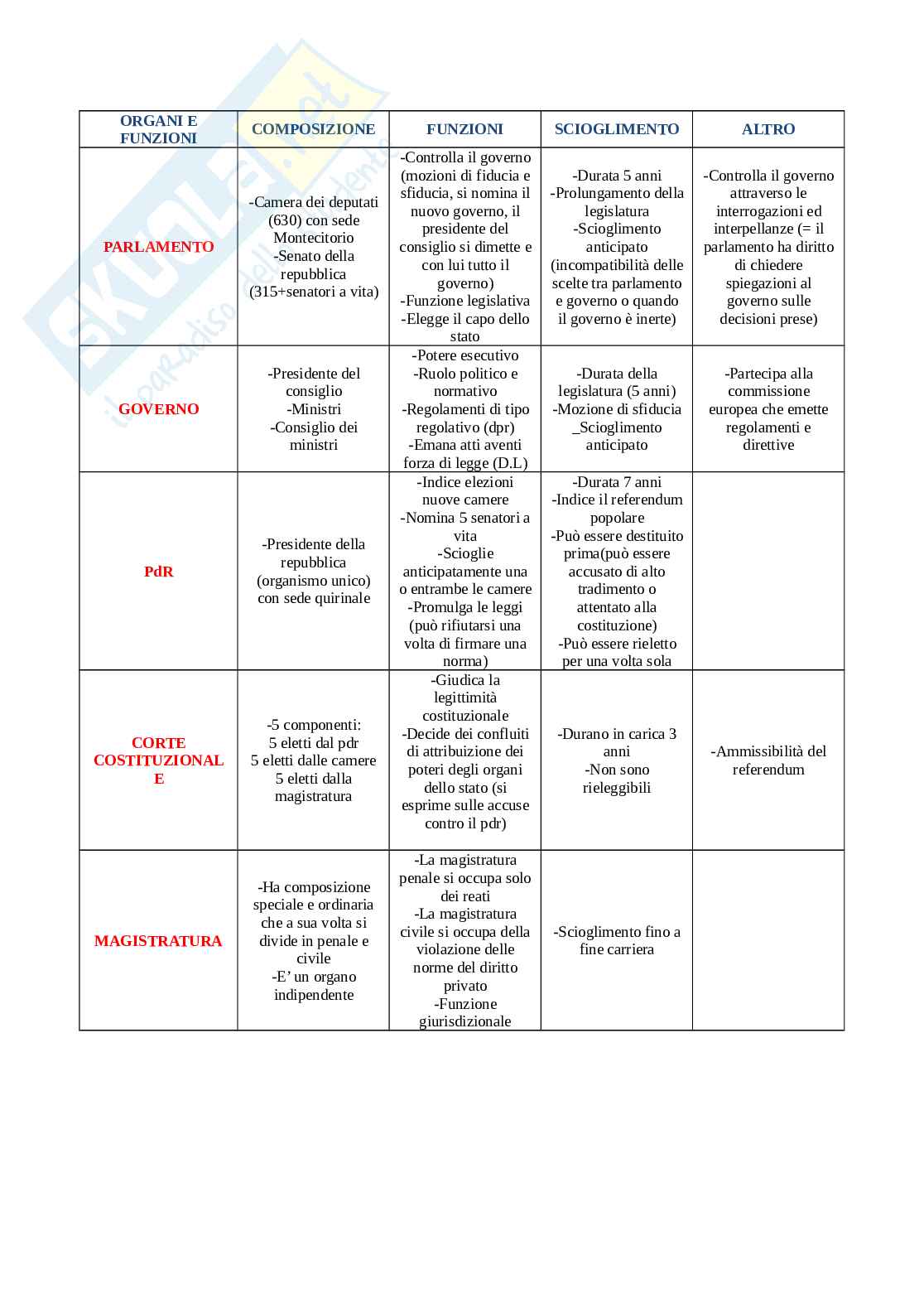 Per ognuno di essi viene sintetizzato a punti e con una piccola spiegazione la loro composizione,le loro funzioni (con eventuale spiegazione delle funzioni)scioglimento (ovvero la durata dell'organo o la possibilità,nel caso ci fosse,di uno scioglimento anticipato)ed imfini il luogo/ sede di ognuno di essi.