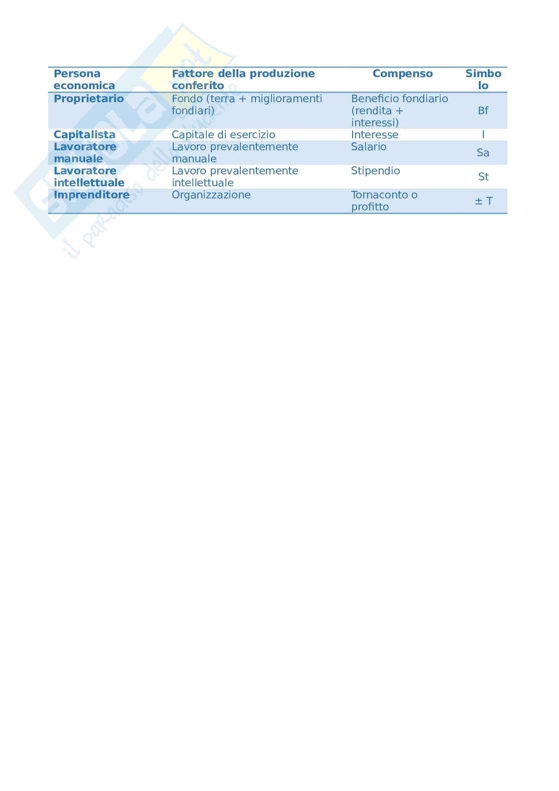 \textrm{Persona economica} & \textrm{Fattore della produzione conferito} & \textrm{Compenso} & \textrm{Simbolo}\\ \hline