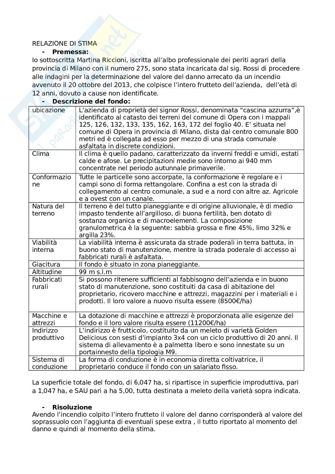 Io sottoscritta Martina Riccioni, iscritta all’albo professionale dei periti agrari della provincia di Milano con il numero 275, sono stata incaricata dal sig. Rossi di procedere alle indagini per la determinazione del valore del danno arrecato da un incendio avvenuto il 20 ottobre del 2013, che colpisce l’intero frutteto dell’azienda, dell’età di 12 anni, dovuto a cause non identificate.