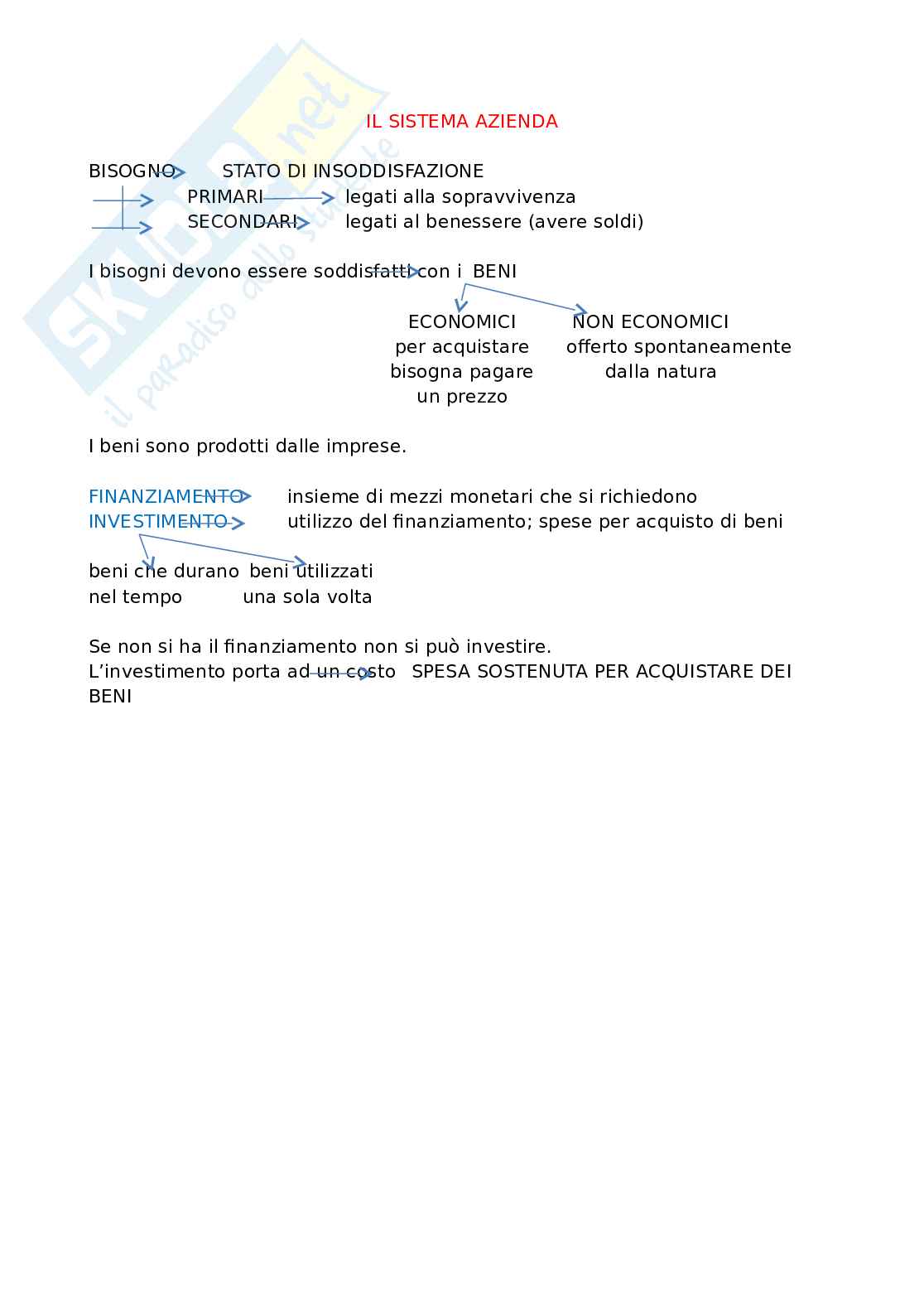 I beni sono prodotti dalle imprese. Si definiscono inoltre finanziamento l'insieme di mezzi monetari che si richiedono e investimento l'utilizzo del finanziamento; spese per acquisto di beni. Questi ultimi inoltre si dividono in due ulteriori categorie, ovvero quelli che durano nel tempo e quelli utilizzati una sola volta.