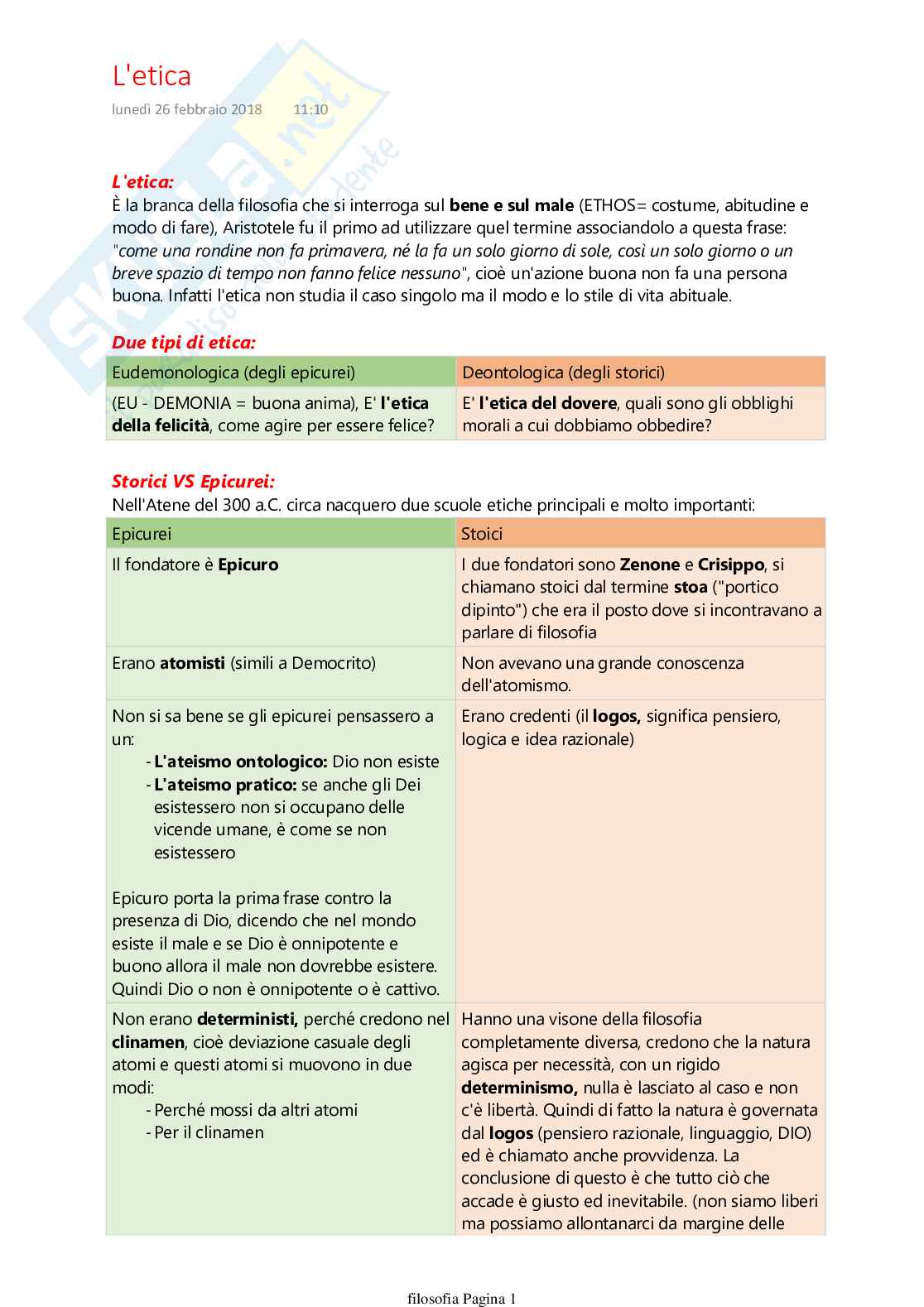 È la branca della filosofia che si interroga sul bene e sul male (ETHOS= costume, abitudine e modo di fare), Aristotele fu il primo ad utilizzare quel termine associandolo a questa frase: "come una rondine non fa primavera, né la fa un solo giorno di sole, così un solo giorno o un breve spazio di tempo non fanno felice nessuno", cioè un'azione buona non fa una persona buona. Infatti l'etica non studia il caso singolo ma il modo e lo stile di vita abituale.