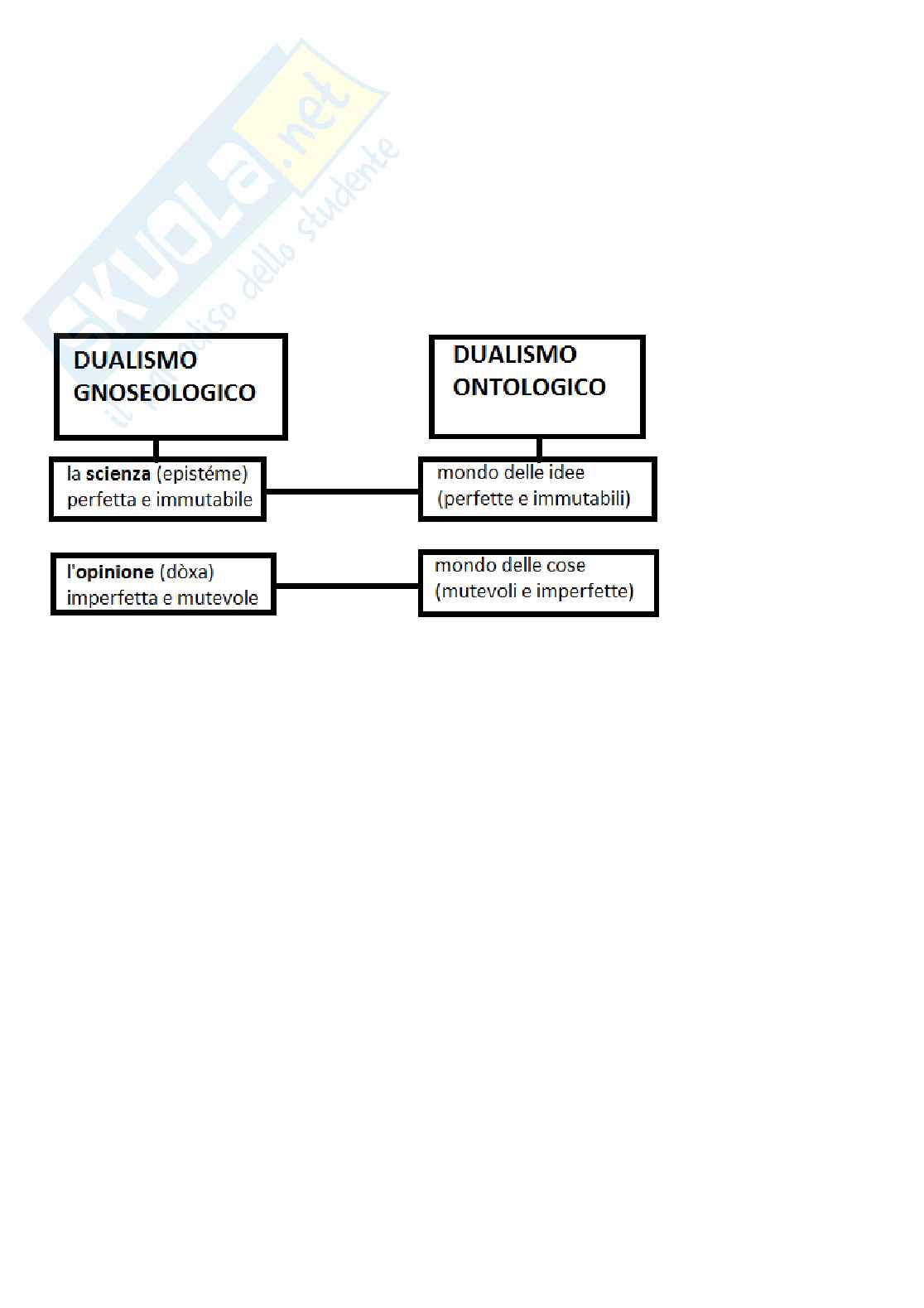 Da quanto detto prima, emerge una netta frattura tra il mondo sensibile e il mondo delle idee. In termini filosofici questa demarcazione viene indicata come "dualismo ontologico" ( cioè dell'essere), a cui corrisponde un "dualismo gnoseologico" (o della conoscenza): il mondo perfetto ed eterno delle idee, infatti rende possibile una conoscenza stabile e universale che coincide con la scienza (epistéme), mentre la dimensione imperfetta e mutevole delle cose sensibili è all'origine della fallace conoscenza dell'opinione (dòxa).