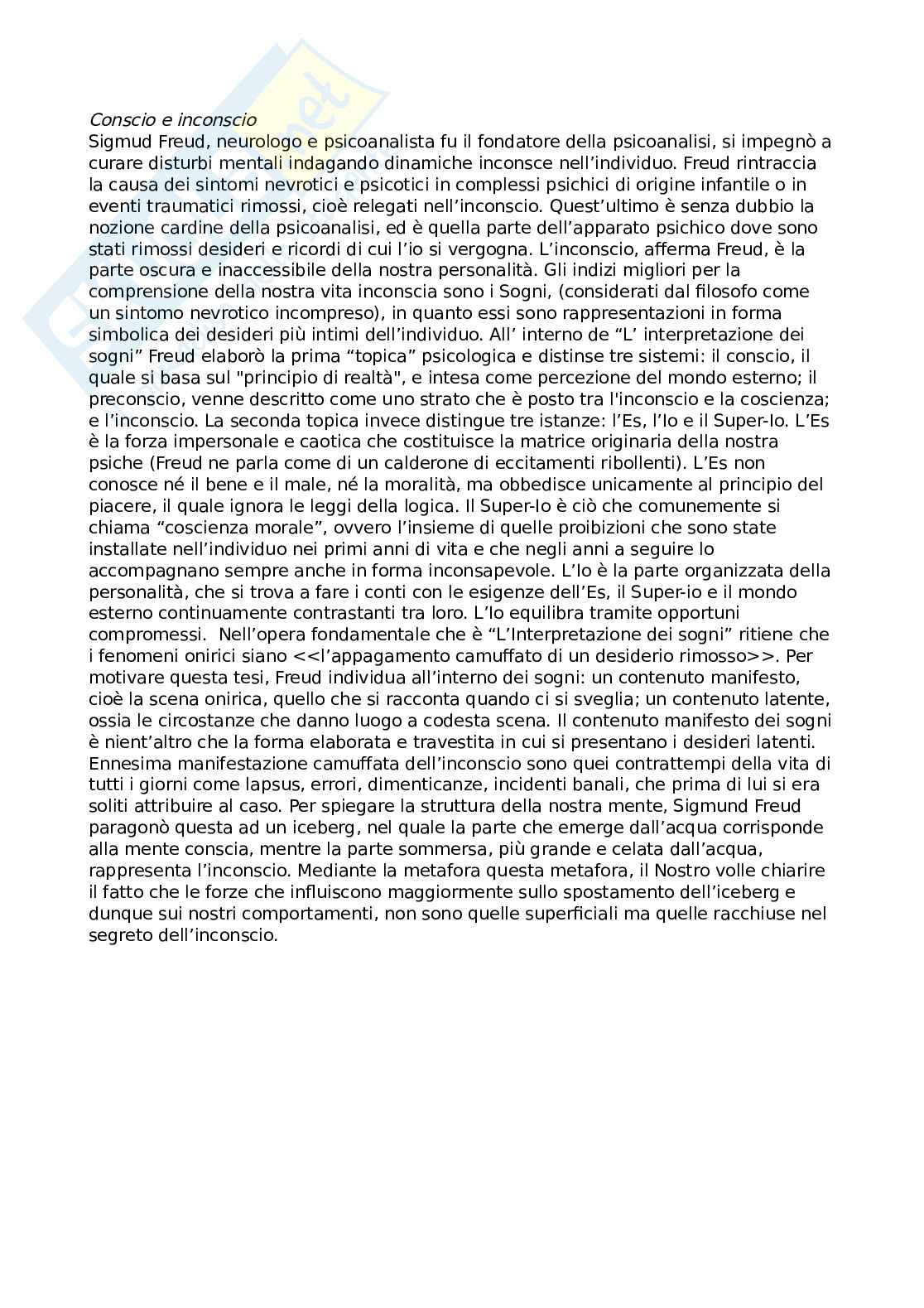 Sigmund Freud, neurologo e psicoanalista fu il fondatore della psicoanalisi, si impegnò a curare disturbi mentali indagando dinamiche inconsce nell’individuo. Freud rintraccia la causa dei sintomi nevrotici e psicotici in complessi psichici di origine infantile o in eventi traumatici rimossi, cioè relegati nell’inconscio. Quest’ultimo è senza dubbio la nozione cardine della psicoanalisi, ed è quella parte dell’apparato psichico dove sono stati rimossi desideri e ricordi di cui l’io si vergogna. L’inconscio, afferma Freud, è la parte oscura e inaccessibile della nostra personalità. Gli indizi migliori per la comprensione della nostra vita inconscia sono i Sogni, (considerati dal filosofo come un sintomo nevrotico incompreso), in quanto essi sono rappresentazioni in forma simbolica dei desideri più intimi dell’individuo. All’ interno de “L’ interpretazione dei sogni” Freud elaborò la prima “topica” psicologica e distinse tre sistemi: il conscio, il quale si basa sul "principio di realtà", e intesa come percezione del mondo esterno; il preconscio, venne descritto come uno strato che è posto tra l'inconscio e la coscienza; e l’inconscio. La seconda topica invece distingue tre istanze: l’Es, l’Io e il Super-Io. L’Es è la forza impersonale e caotica che costituisce la matrice originaria della nostra psiche (Freud ne parla come di un calderone di eccitamenti ribollenti). L’Es non conosce né il bene e il male, né la moralità, ma obbedisce unicamente al principio del piacere, il quale ignora le leggi della logica. Il Super-Io è ciò che comunemente si chiama “coscienza morale”, ovvero l’insieme di quelle proibizioni che sono state installate nell’individuo nei primi anni di vita e che negli anni a seguire lo accompagnano sempre anche in forma inconsapevole. L’Io è la parte organizzata della personalità, che si trova a fare i conti con le esigenze dell’Es, il Super-io e il mondo esterno continuamente contrastanti tra loro. L’Io equilibra tramite opportuni compromessi. Nell’opera fondamentale che è “L’Interpretazione dei sogni” ritiene che i fenomeni onirici siano <<l’appagamento camuffato di un desiderio rimosso>>. Per motivare questa tesi, Freud individua all’interno dei sogni: un contenuto manifesto, cioè la scena onirica, quello che si racconta quando ci si sveglia; un contenuto latente, ossia le circostanze che danno luogo a codesta scena. Il contenuto manifesto dei sogni è nient’altro che la forma elaborata e travestita in cui si presentano i desideri latenti. Ennesima manifestazione camuffata dell’inconscio sono quei contrattempi della vita di tutti i giorni come lapsus, errori, dimenticanze, incidenti banali, che prima di lui si era soliti attribuire al caso. Per spiegare la struttura della nostra mente, Sigmund Freud paragonò questa ad un iceberg, nel quale la parte che emerge dall’acqua corrisponde alla mente conscia, mentre la parte sommersa, più grande e celata dall’acqua, rappresenta l’inconscio. Mediante la metafora questa metafora, il Nostro volle chiarire il fatto che le forze che influiscono maggiormente sullo spostamento dell’iceberg e dunque sui nostri comportamenti, non sono quelle superficiali ma quelle racchiuse nel segreto dell’inconscio.