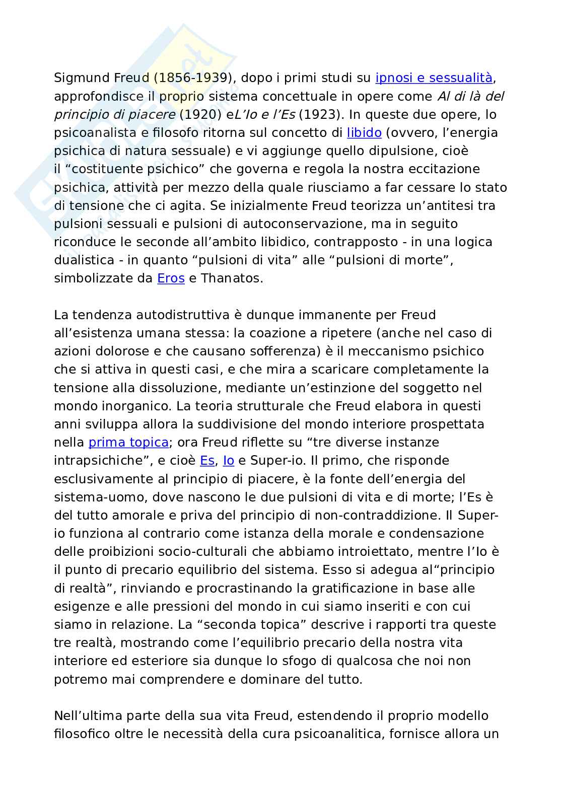 La tendenza autodistruttiva è dunque immanente per Freud all’esistenza umana stessa: la coazione a ripetere (anche nel caso di azioni dolorose e che causano sofferenza) è il meccanismo psichico che si attiva in questi casi, e che mira a scaricare completamente la tensione alla dissoluzione, mediante un’estinzione del soggetto nel mondo inorganico. La teoria strutturale che Freud elabora in questi anni sviluppa allora la suddivisione del mondo interiore prospettata nella prima topica; ora Freud riflette su “tre diverse instanze intrapsichiche”, e cioè Es, Io e Super-io. Il primo, che risponde esclusivamente al principio di piacere, è la fonte dell’energia del sistema-uomo, dove nascono le due pulsioni di vita e di morte; l’Es è del tutto amorale e priva del principio di non-contraddizione. Il Super-io funziona al contrario come istanza della morale e condensazione delle proibizioni socio-culturali che abbiamo introiettato, mentre l’Io è il punto di precario equilibrio del sistema. Esso si adegua al“principio di realtà”, rinviando e procrastinando la gratificazione in base alle esigenze e alle pressioni del mondo in cui siamo inseriti e con cui siamo in relazione. La “seconda topica” descrive i rapporti tra queste tre realtà, mostrando come l’equilibrio precario della nostra vita interiore ed esteriore sia dunque lo sfogo di qualcosa che noi non potremo mai comprendere e dominare del tutto.