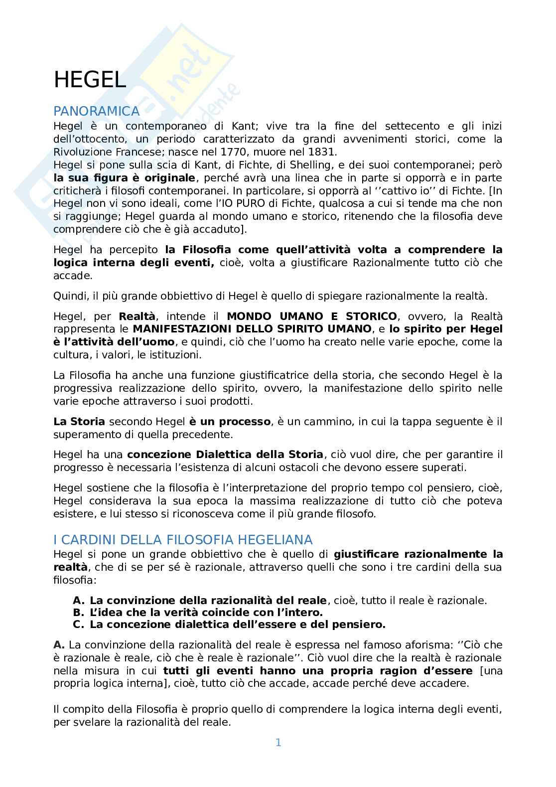 Hegel si pone sulla scia di Kant, di Fichte, di Shelling, e dei suoi contemporanei; però la sua figura è originale, perché avrà una linea che in parte si opporrà e in parte criticherà i filosofi contemporanei. In particolare, si opporrà al ‘’cattivo io’’ di Fichte. [In Hegel non vi sono ideali, come l’IO PURO di Fichte, qualcosa a cui si tende ma che non si raggiunge; Hegel guarda al mondo umano e storico, ritenendo che la filosofia deve comprendere ciò che è già accaduto].