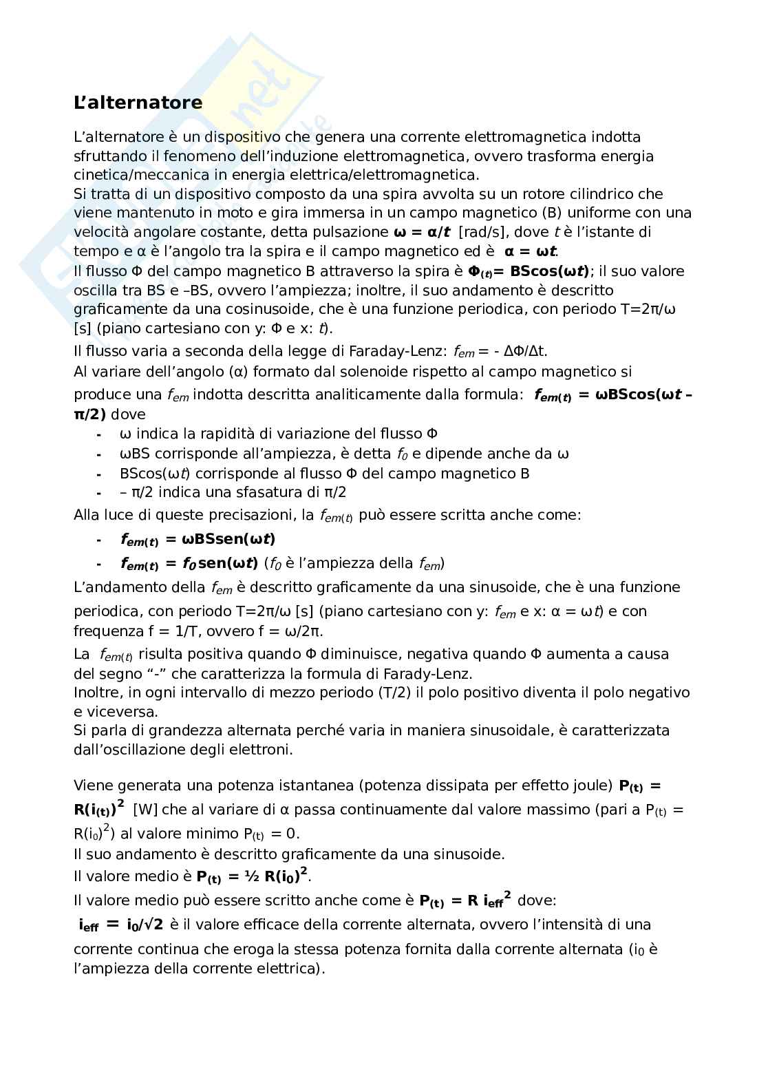 Si tratta di un dispositivo composto da una spira avvolta su un rotore cilindrico che viene mantenuto in moto e gira immersa in un campo magnetico (B) uniforme con una velocità angolare costante, detta pulsazione ω = α/t [rad/s], dove t è l’istante di tempo e α è l’angolo tra la spira e il campo magnetico ed è α = ωt.
