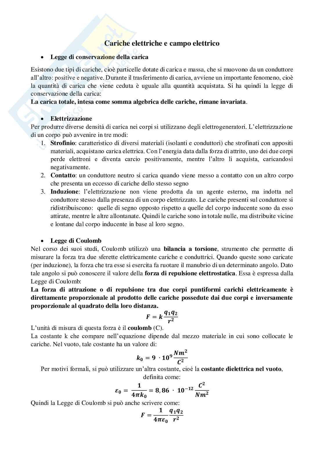 ALLEGATO [con formule matematiche]: Legge di Coulomb; campo elettrico; campo elettrico di carica puntiforme; principio di sovrapposizione dei campi; flusso del campo elettrico; teorema di Gauss; campi elettrici a simmetria sferica; campo elettrico generato da una distribuzione lineare omogenea e infinita di carica; campo generato da una distribuzione piana, omogenea e infinita di carica; campo generato da due distribuzioni di cariche piane, infinite, omogenee, parallele, di segno opposto e uguale densità superficiale