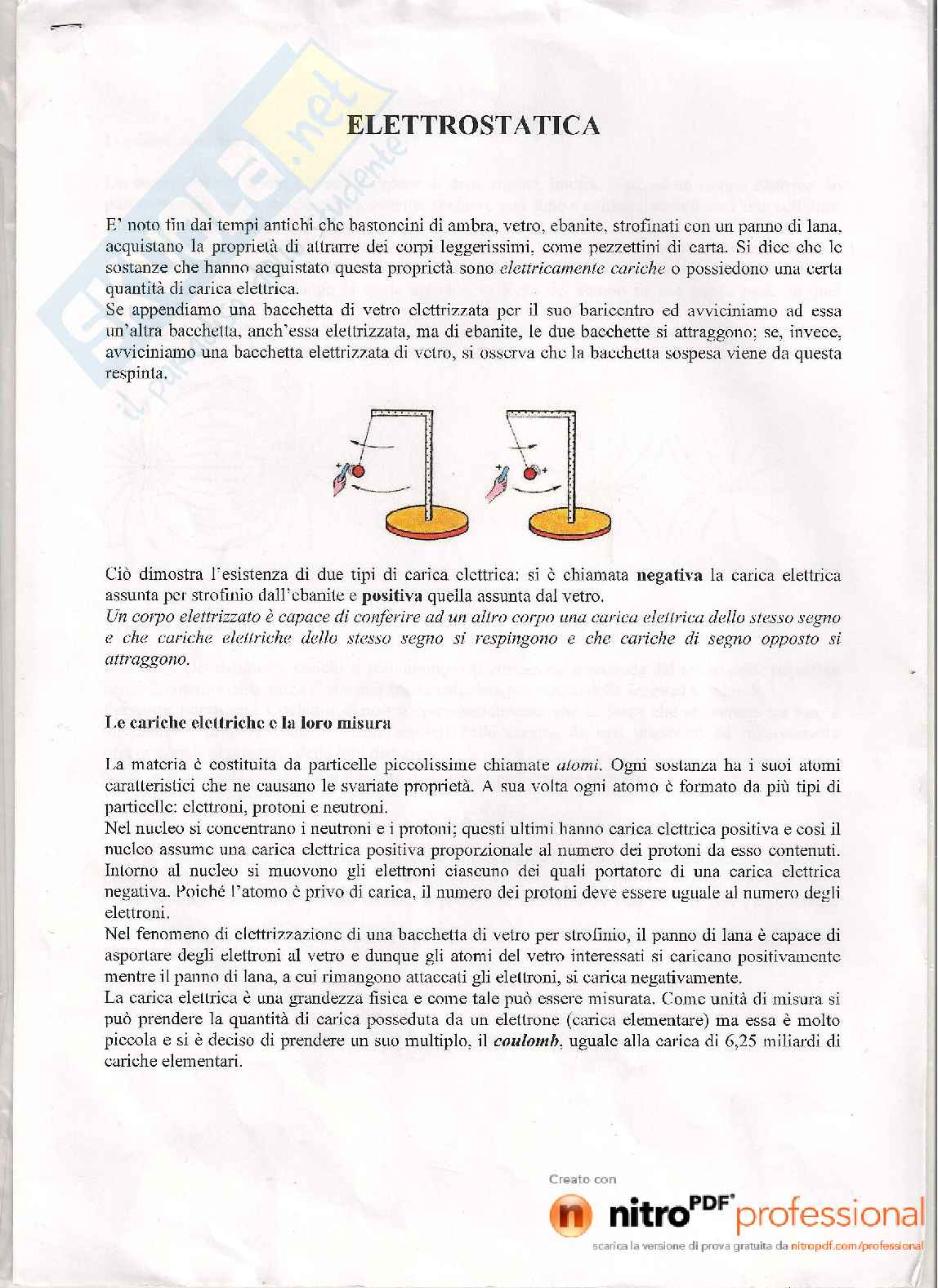 Elettrostatica: le cariche elettriche e la loro misura, il campo elettrico, la legge di Coulomb, conduttori, potenziale elettrico, capacità elettrica, condensatori, condensatori in serie, condensatori in parallelo.