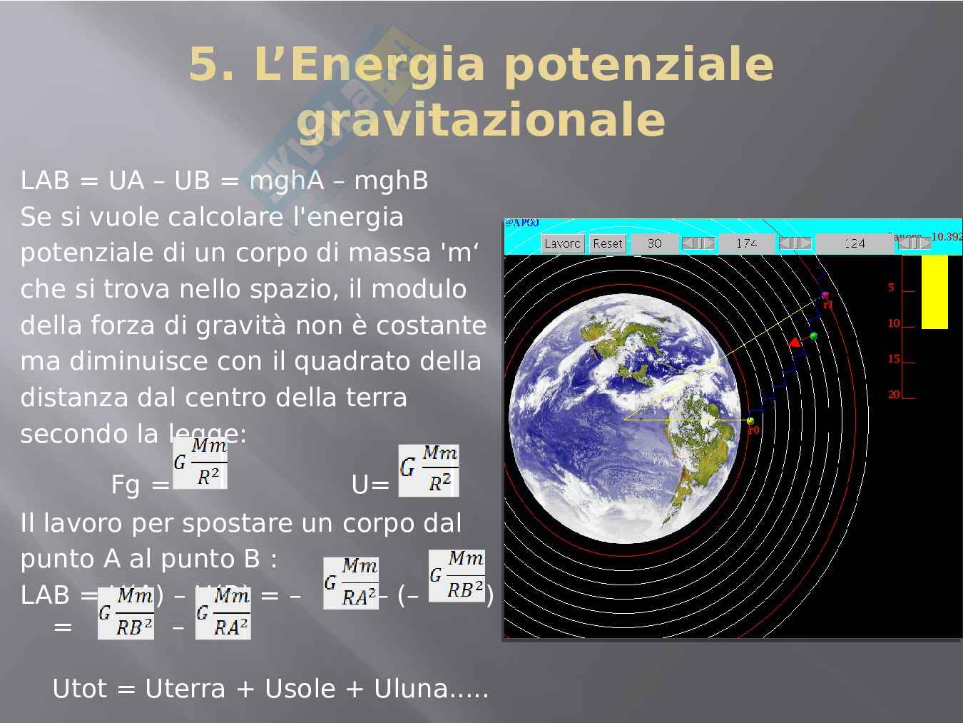 Nell'allegato si trova la presentazione powerpoint sul concetto di enrgia potenziale gravitazionale. Sono descritti i passaggi matematici per arrivare alla legge: U(r)=-G(mM/R) ed è presente il grafico dell'energia potenziale gravitazionale in funzione della distanza dalla Terra.