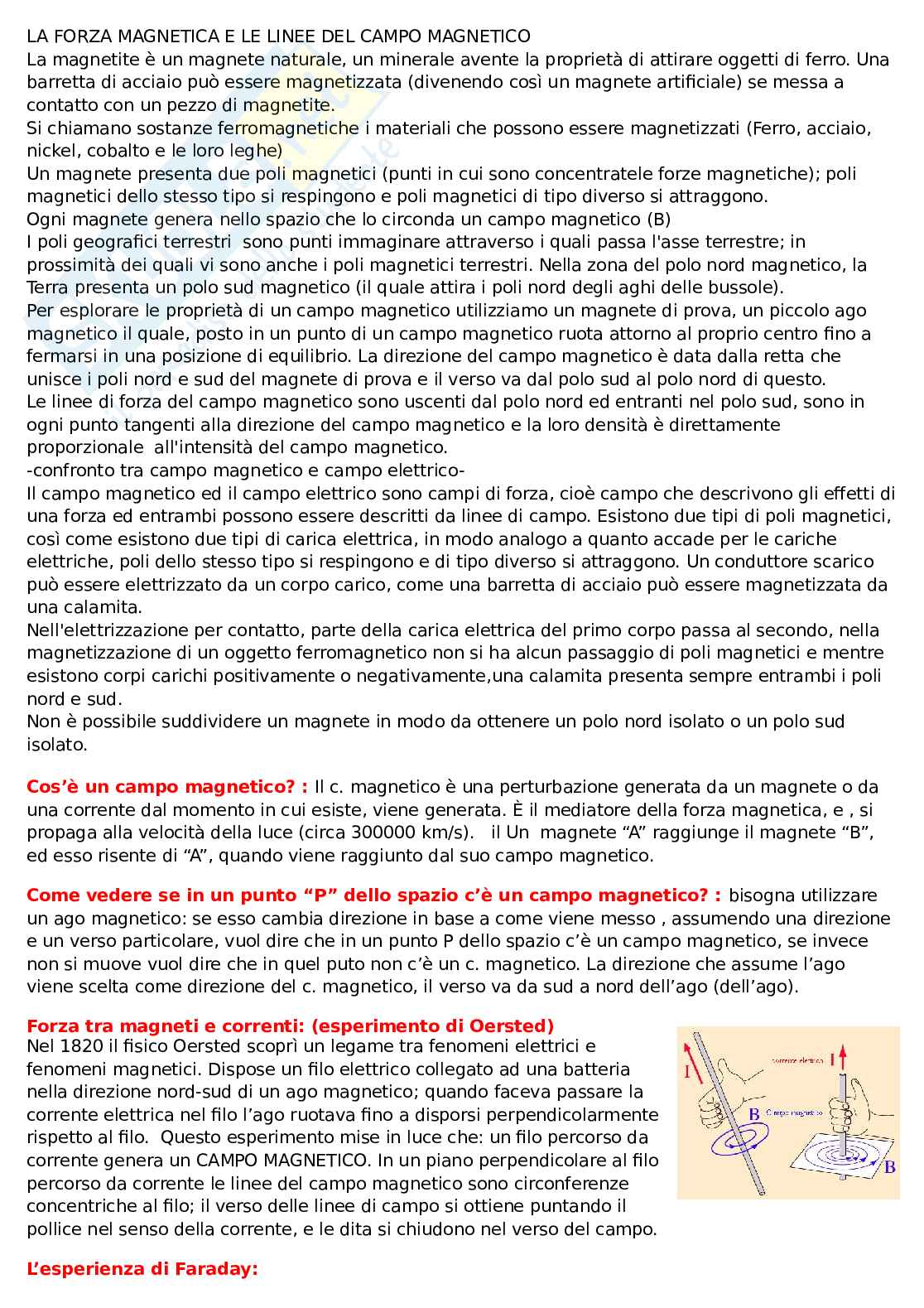Nel 1820 il fisico Oersted scoprì un legame tra fenomeni elettrici e fenomeni magnetici. Dispose un filo elettrico collegato ad una batteria nella direzione nord-sud di un ago magnetico; quando faceva passare la corrente elettrica nel filo l’ago ruotava fino a disporsi perpendicolarmente rispetto al filo. Questo esperimento mise in luce che: un filo percorso da corrente genera un campo magnetico. In un piano perpendicolare al filo percorso da corrente le linee del campo magnetico sono circonferenze concentriche al filo; il verso delle linee di campo si ottiene puntando il pollice nel senso della corrente, e le dita si chiudono nel verso del campo.