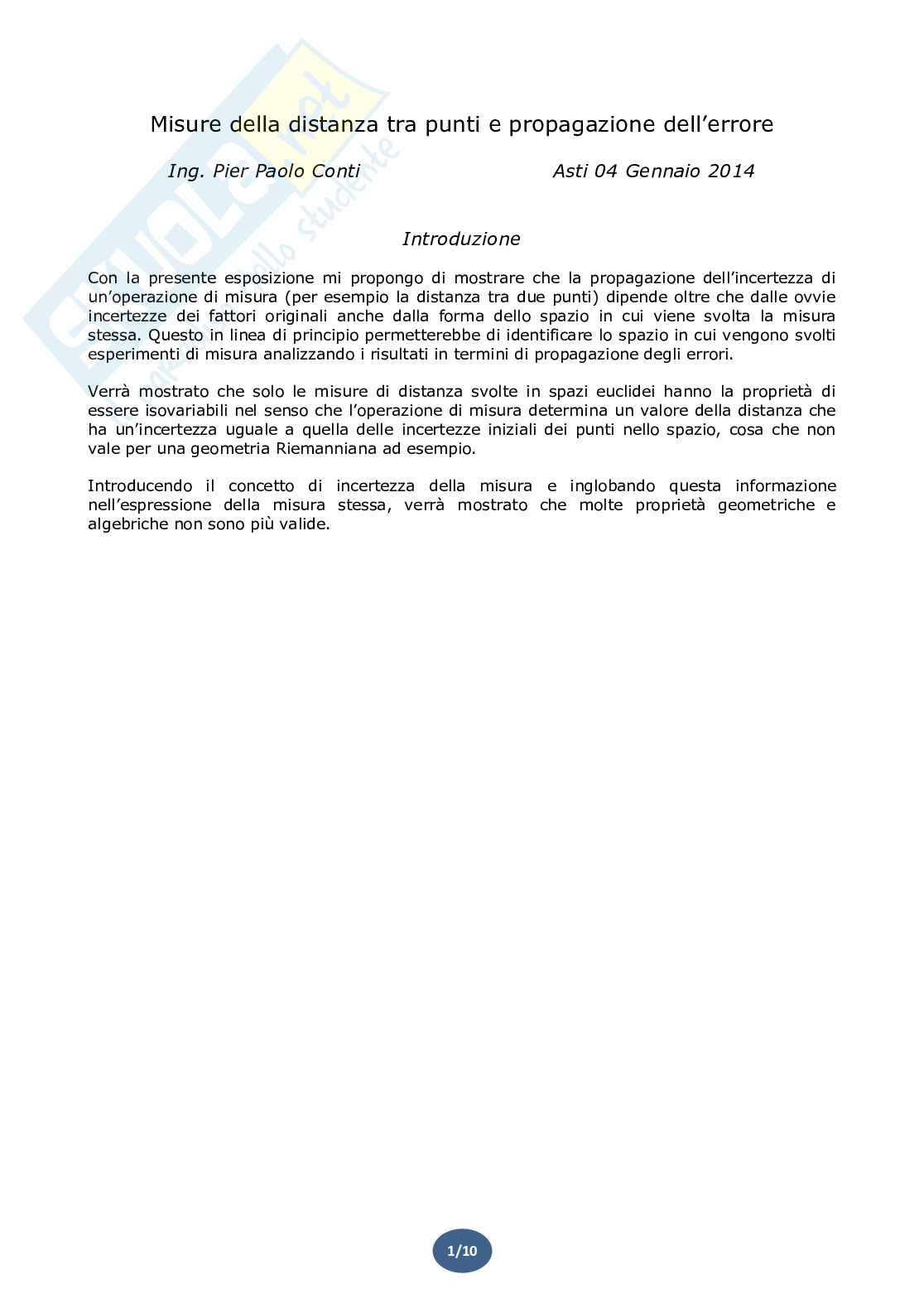 Questo in linea di principio permetterebbe di identificare lo spazio in cui vengono svolti esperimenti di misura analizzando i risultati in termini di propagazione degli errori. Verrà mostrato che solo le misure di distanza svolte in spazi euclidei hanno la proprietà di essere isovariabili nel senso che l'operazione di misura determina un valore della distanza che ha un'incertezza uguale a quella delle incertezze iniziali dei punti nello spazio, cosa che non vale per una geometria Riemanniana ad esempio. Introducendo il concetto di incertezza della misura e inglobando questa informazione nell'espressione della misura stessa, verrà mostrato che molte proprietà geometriche e algebriche non sono più valide.Misure della distanza tra punti e propagazione dell’errore