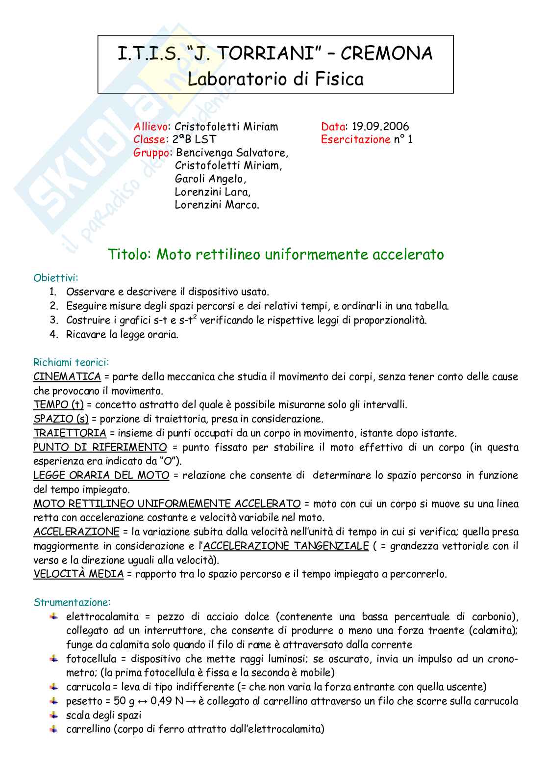 oraria del moto rettilineo uniformemente accelerato, con la velocità iniziale pari allo zero.