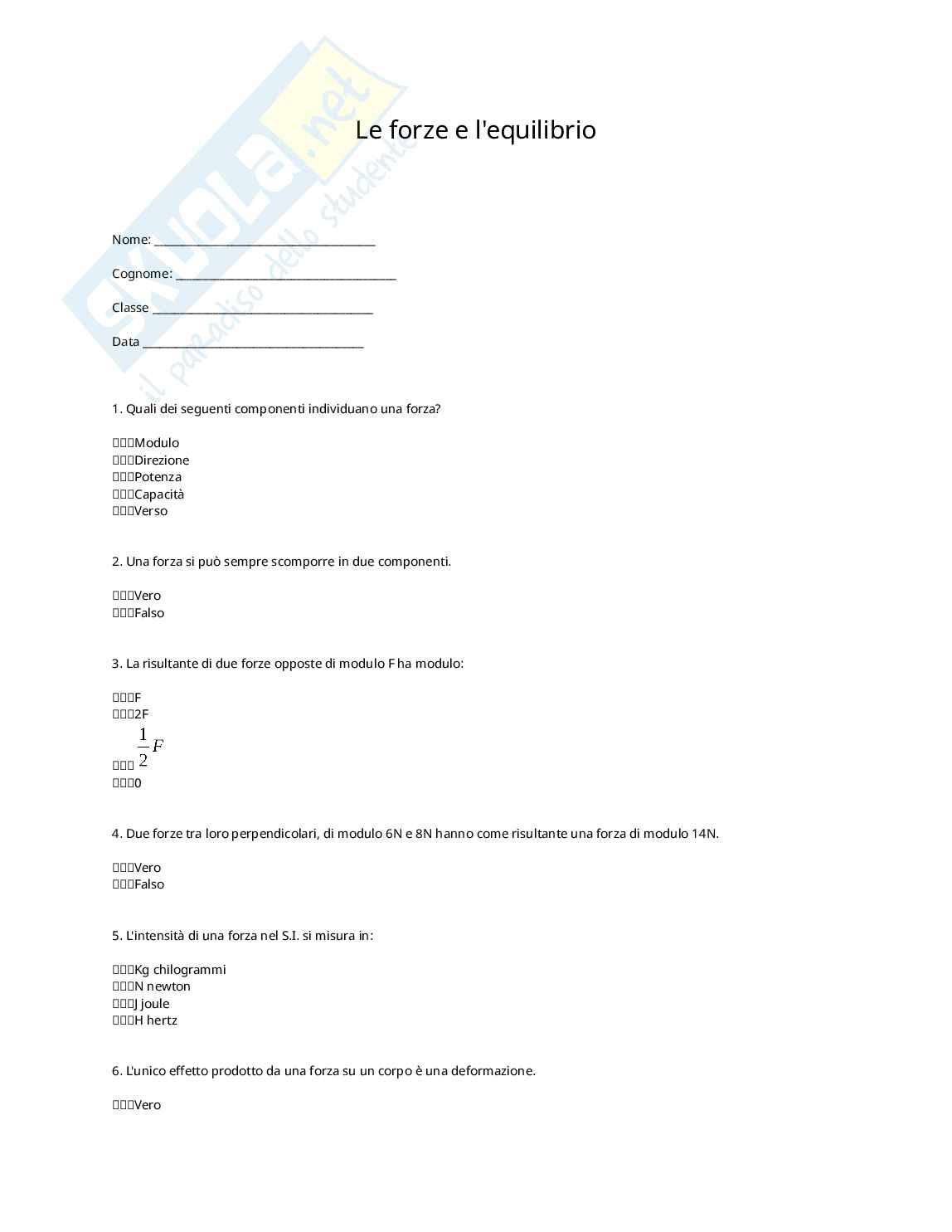 3. La risultante di due forze opposte di modulo F ha modulo: