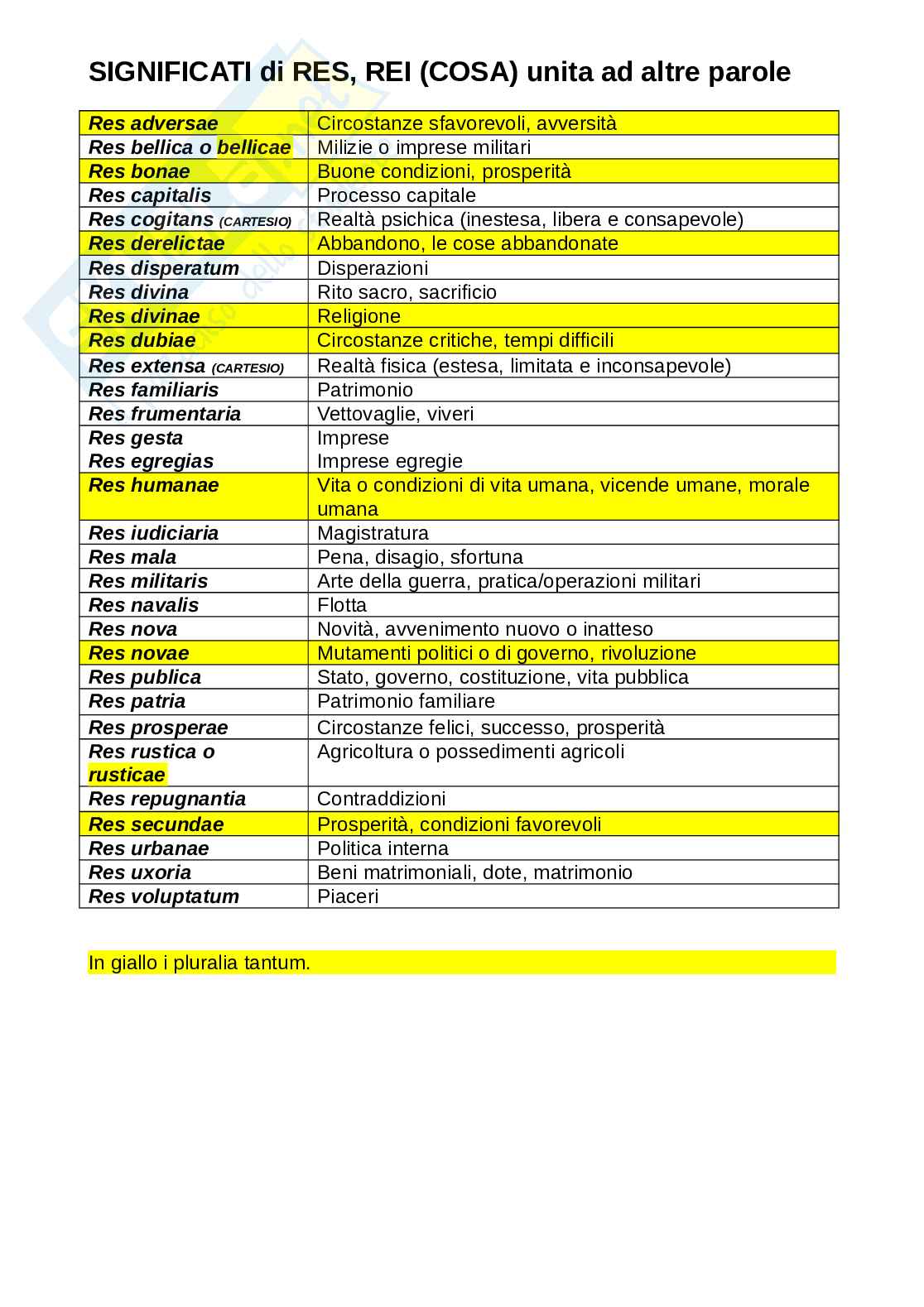 Tale termine, se unito ad alcuni plurali, forma i pluralia tantum. Res spesso si omette al nominativo e all'accusativo, sostituendolo con l'aggettivo neutro che l'accompagna (Es.: multae res = multa). Questo sostantivo viene tuttora utilizzato nel linguaggio giuridico moderno e veniva impiegato anche in alcune espressioni del linguaggio filosofico della scolastica; nell'ambito filosfico ritroviamo la distinzione tra "Res extensa" e "Rex cogitans", ad opera di Cartesio (dualismo cartesiano).