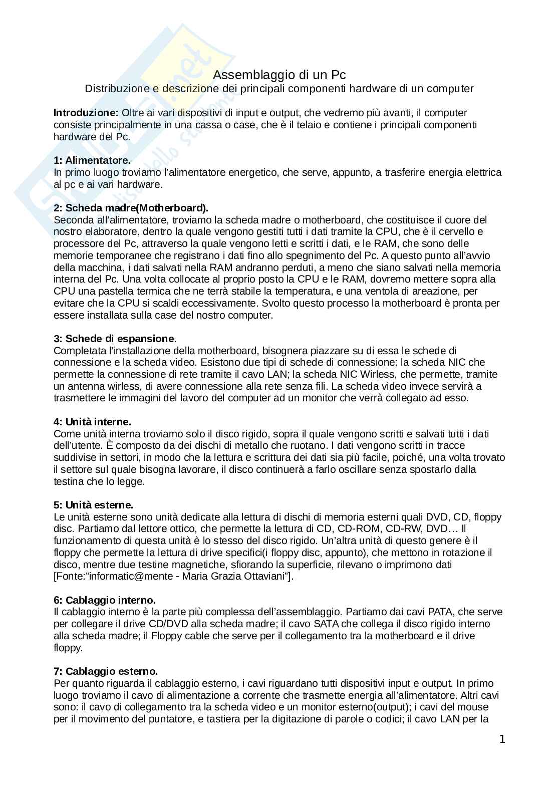 Introduzione: Oltre ai vari dispositivi di input e output, che vedremo più avanti, il computer consiste principalmente in una cassa o case, che è il telaio e contiene i principali componenti hardware del Pc.