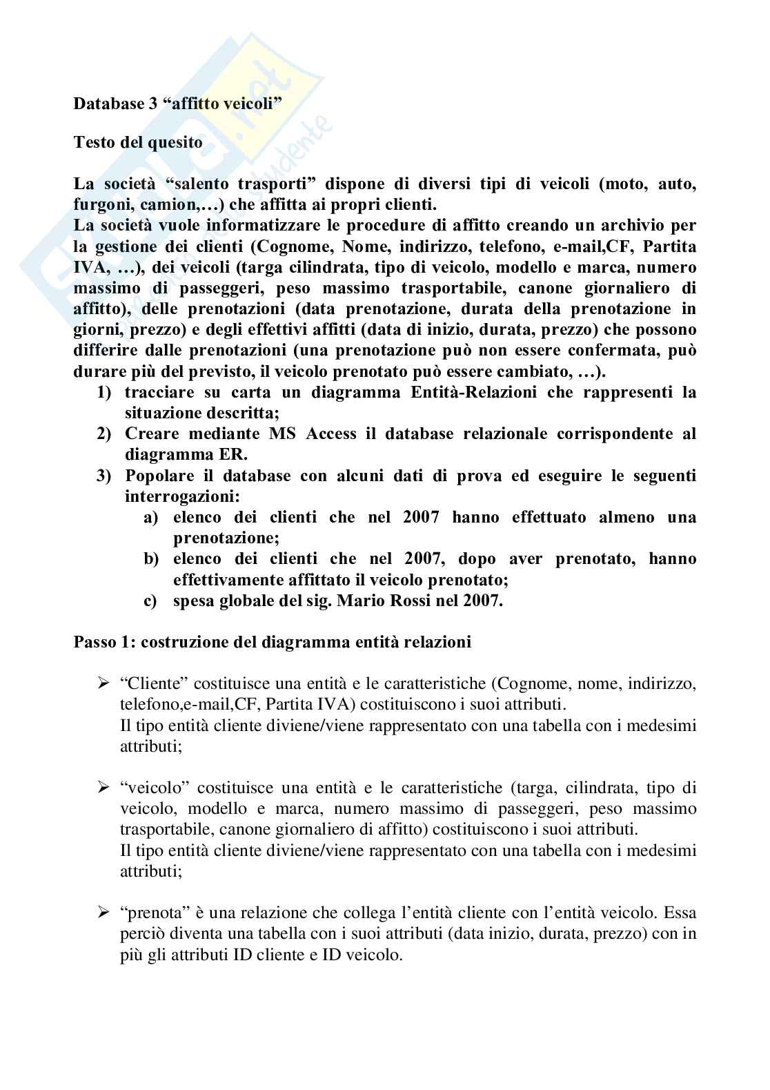 La società vuole informatizzare le procedure di affitto creando un archivio per la gestione dei clienti (Cognome, Nome, indirizzo, telefono, e-mail,CF, Partita IVA, ...), dei veicoli (targa cilindrata, tipo di veicolo, modello e marca, numero massimo di passeggeri, peso massimo trasportabile, canone giornaliero di affitto), delle prenotazioni (data prenotazione, durata della prenotazione in giorni, prezzo) e degli effettivi affitti (data di inizio, durata, prezzo) che possono differire dalle prenotazioni (una prenotazione può non essere confermata, può durare più del previsto, il veicolo prenotato può essere cambiato, ...).