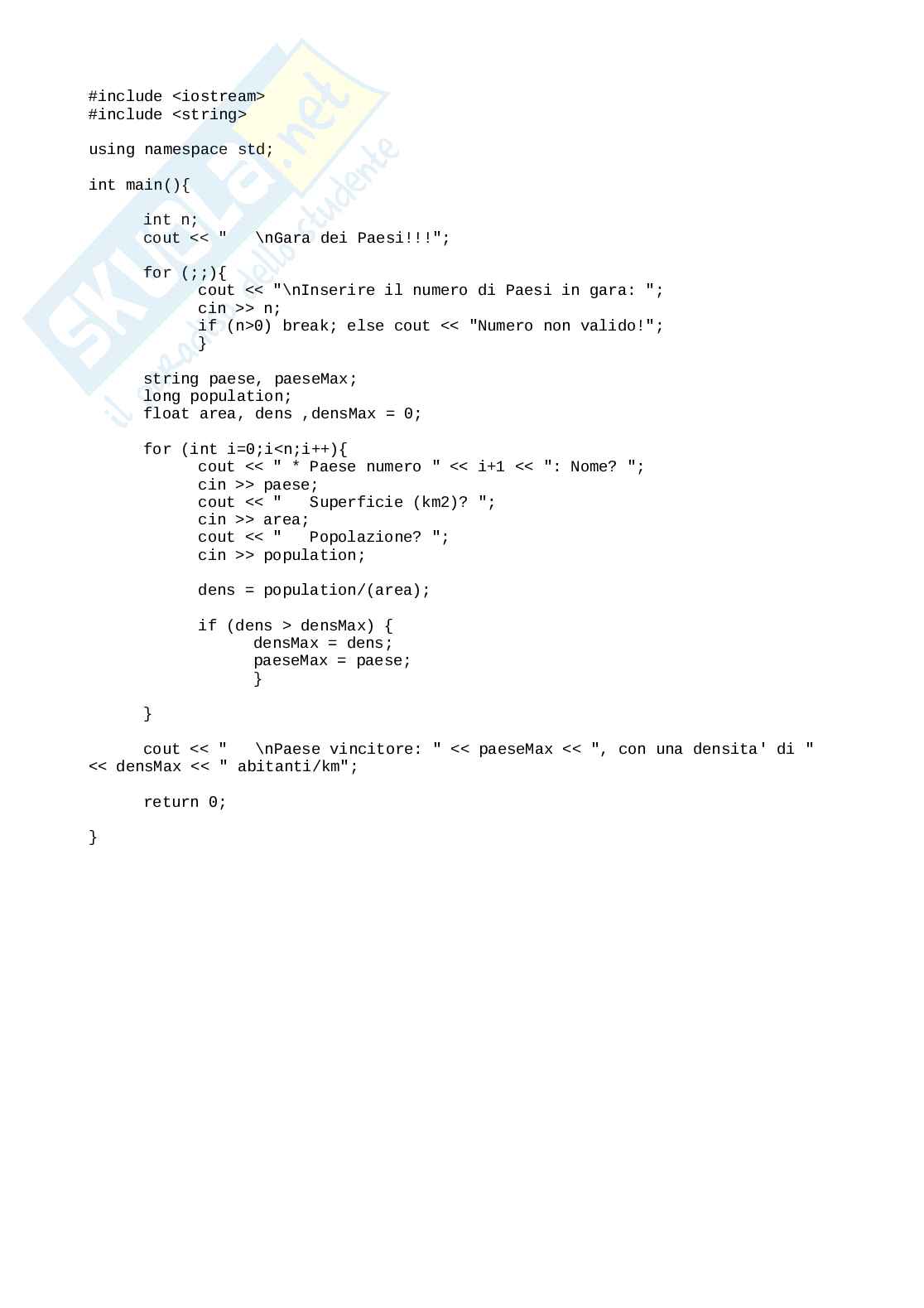 Il programma permette di domandare all'untete il numero di paesi presi in considerazione per ognuno domanda il nome, superficie in km2, popolazione.